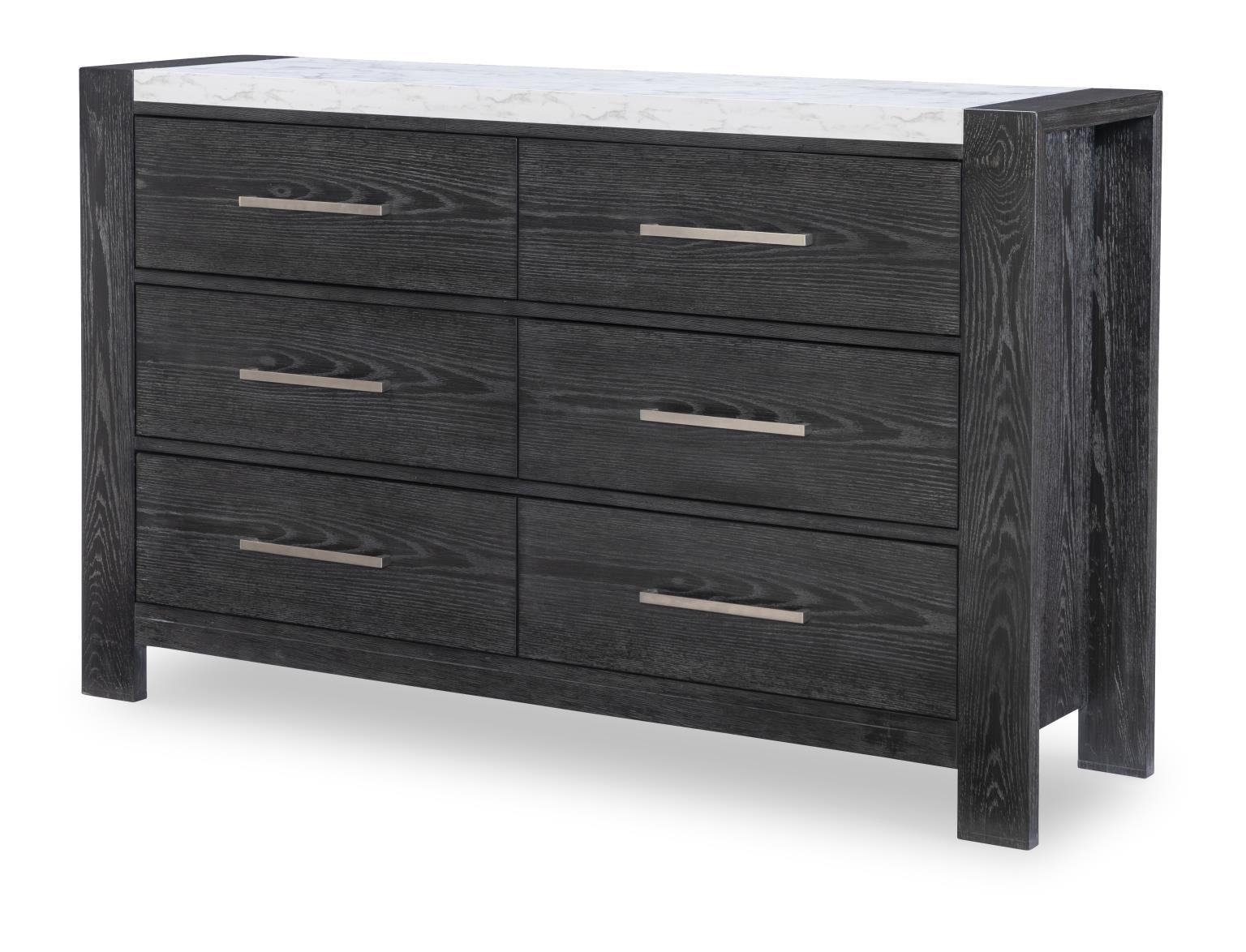 Casual elegance meets refined detail with the 5031 Horizons bedroom. The rich Espresso finish highlights the transitional appeal of oak veneer and select hardwood solids,, while modern design elements lend a fresh,, elevated touch to the bedroom. Marble laminate tops on the cases provide a cool contrast to the deep wood tones. Brushed nickel hardware pops against the dark finish. The panel headboard and dresser mirror feature marble laminate accents,, adding visual interest and tying into the case design. Designed with thoughtful craftsmanship,, drawers are built with French dovetail construction and ball bearing metal side glides,, offering smooth,, quiet function and quality. The bed is offered in twin,, full,, queen and king sizes.