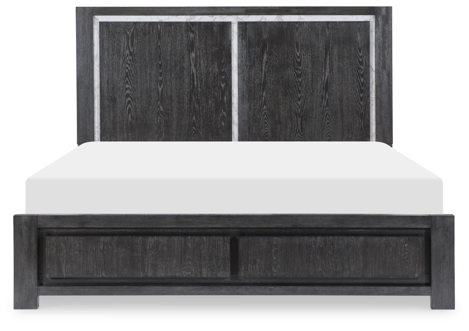 Casual elegance meets refined detail with the Horizons bedroom. The rich finish highlights the transitional appeal of oak veneer and select hardwood solids,, while modern design elements lend a fresh,, elevated touch to the bedroom. Marble laminate tops on the cases provide a cool contrast to the deep wood tones. Brushed nickel hardware pops against the dark finish. The panel headboard and dresser mirror feature marble laminate accents,, adding visual interest and tying into the case design. Designed with thoughtful craftsmanship,, drawers are built with French dovetail construction and ball bearing metal side glides,, offering smooth,, quiet function and quality. The bed is offered in twin,, full,, queen and king sizes.