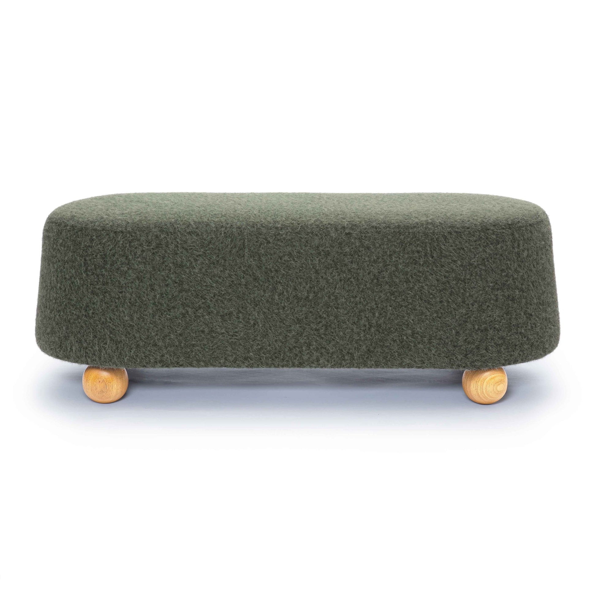 Add a playful charm to your space with the Jaine Stool, boasting a slightly conical shape that catches the eye. Its spherical solid wood legs provide a sturdy base, while the nubby boucle or loose faux mohair upholsteries add a modern, textured touch. Not only is it on-trend with its color palette, but this ottoman also seamlessly blends contemporary style with a tactile experience, making it a must-have for any room. Also available in two size variations!