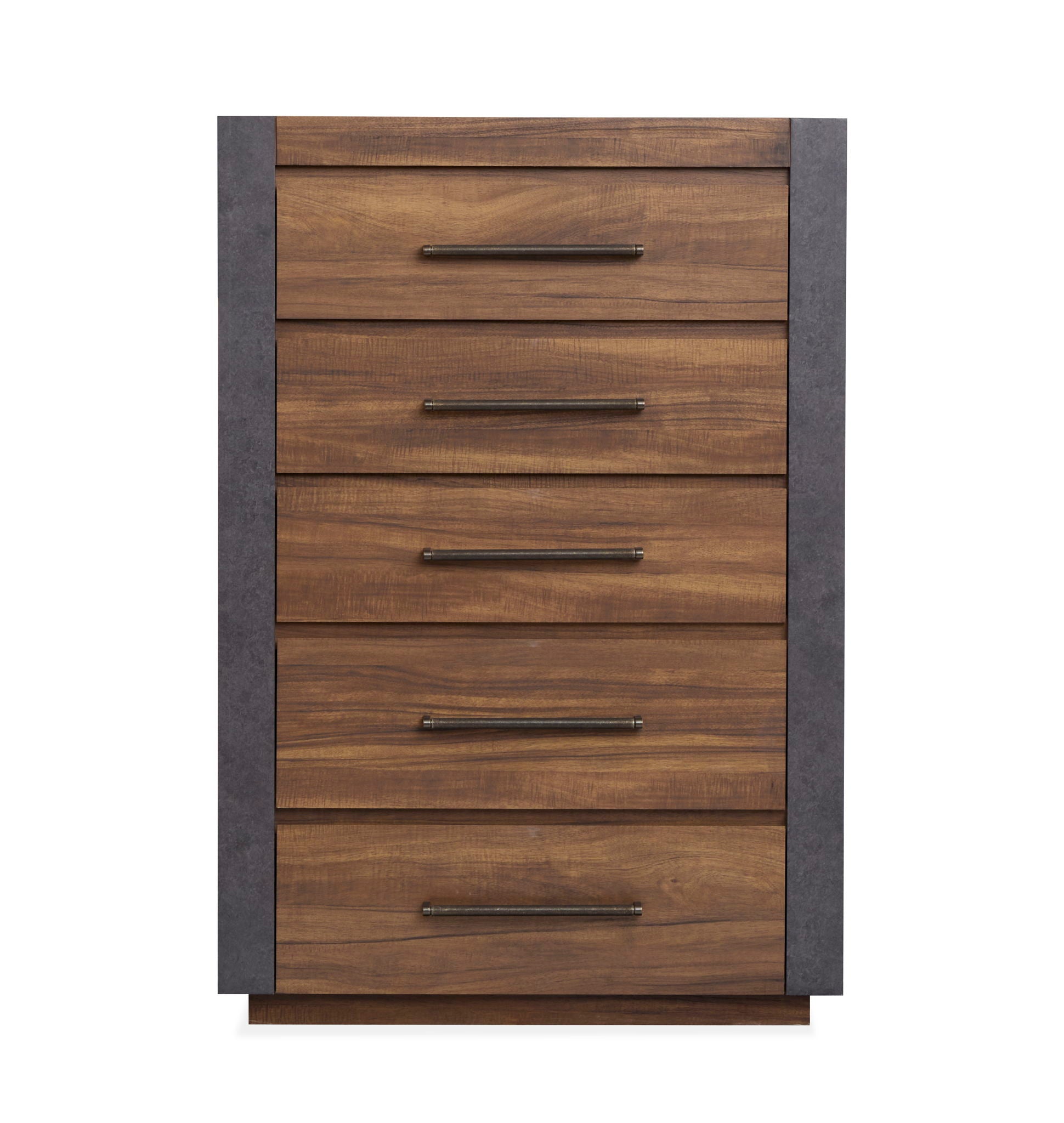 The Jensen Collection embodies the raw and edgy appeal of modern industrial style and featuring a Tavern Brown finish paired with Verona Bronze hardware for a rugged and utilitarian look. The casegoods showcase the perfect balance of wood and aged metal laminate and creating a striking mixed-media effect with bold and masculine lines. Set-back rails on the case fronts enhance the industrial aesthetic and adding depth and visual interest. Perfect for those seeking a bold and industrial-inspired retreat and the Jensen Collection will bring a dynamic and modern edge to your bedroom.