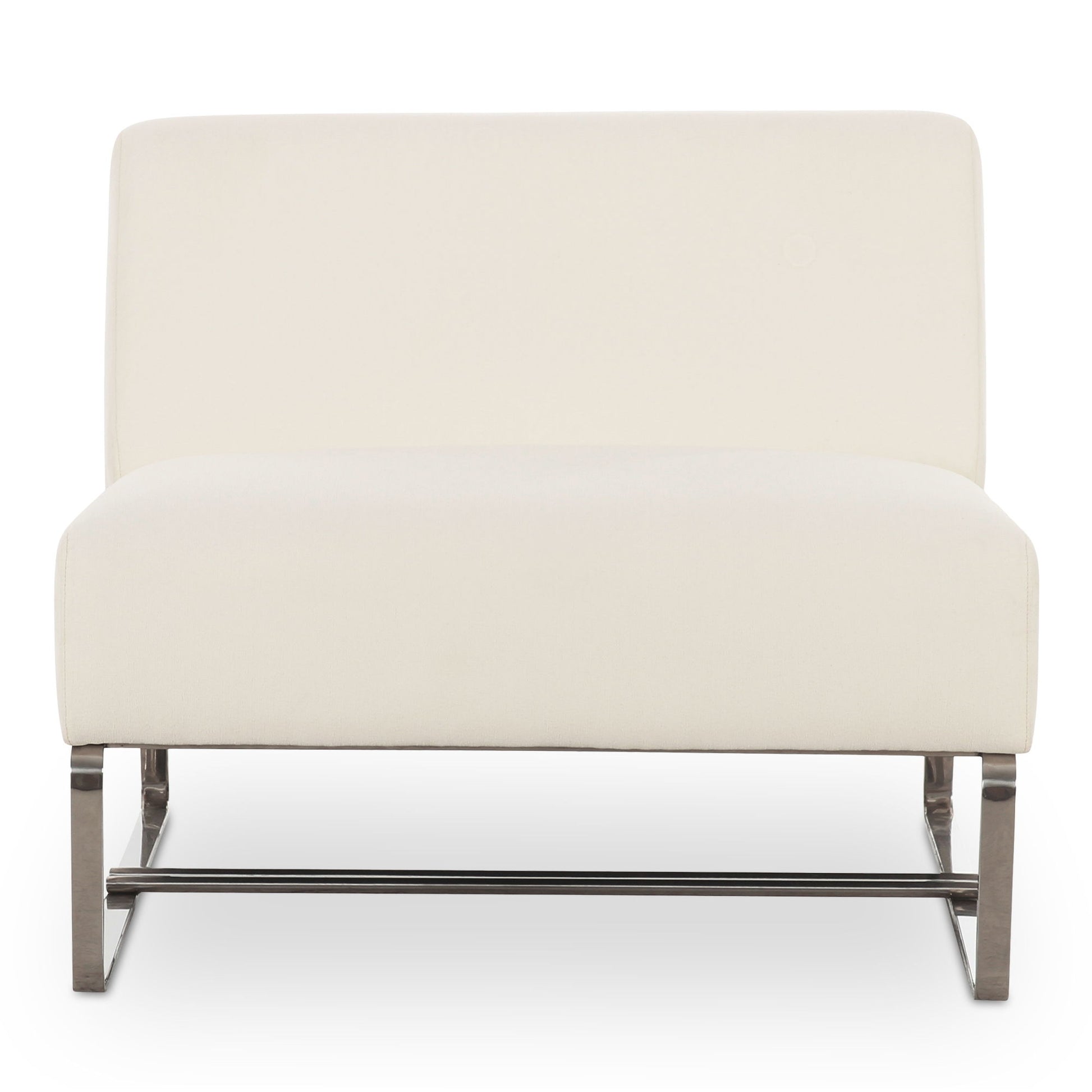 The Jules outdoor accent chair features an armless design with a wide, soft, padded seat that invites hours of relaxation. The chair stands on a shiny, chrome metal base, giving it a sleek, updated look, while its water-resistant, all-weather fabric upholstery makes it a practical outdoor perch.