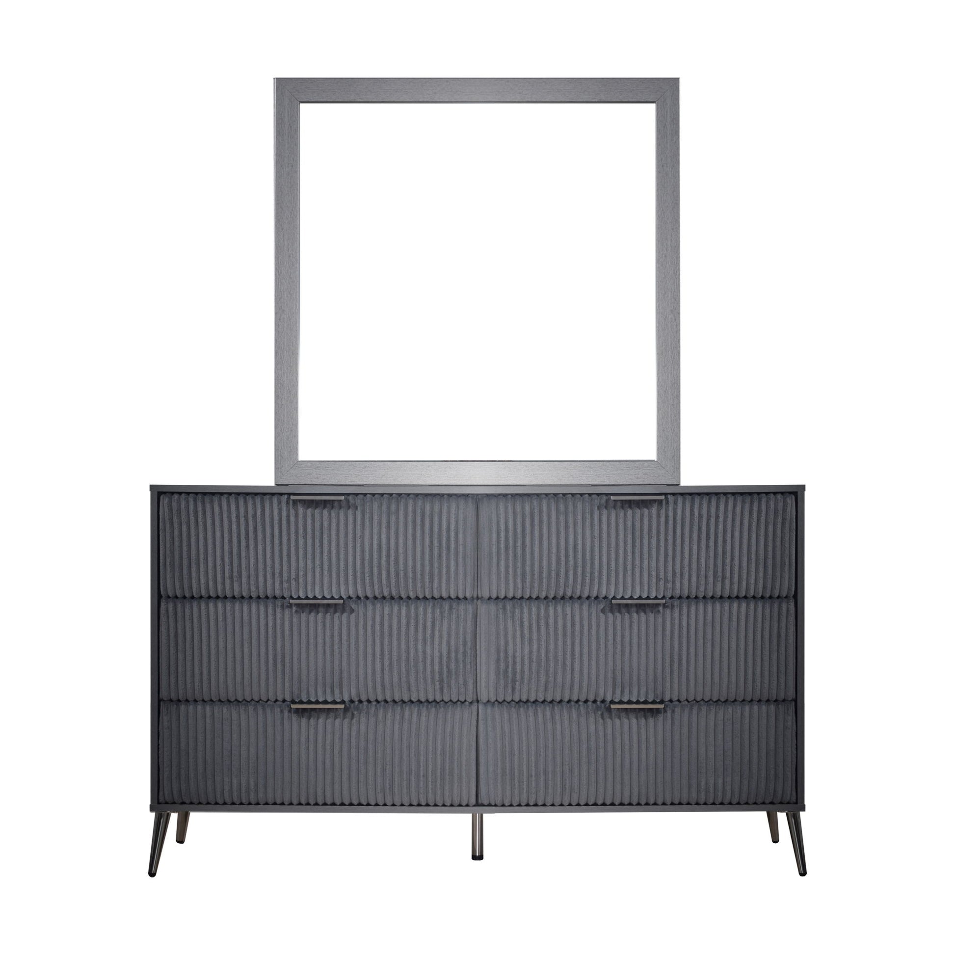 The Kailani 2 Piece Dresser and Mirror Set is a stunning combination of modern design, durability, and eco-friendly craftsmanship, making it an elegant addition to any bedroom. This set includes a dresser and mirror, both expertly crafted from a blend of solid rubberwood, engineered wood, and eco-friendly decorative laminate. The durable construction ensures the furniture maintains its beauty with minimal maintenance, offering superior resistance to scratches, moisture, and stains. The modern minimalist design, featuring clean lines, a sleek silhouette, and a chic ribbed texture, is enhanced by slim metallic handles and tapered legs, adding a sophisticated yet functional touch to your space. The dresser’s textured drawers, wrapped in luxurious 100% Polyester Velvet and accented by gleaming gold pulls and angled legs, bring a touch of glamour to the room. The low-distortion mirror offers crystal-clear reflection, combining both function and elegance. Thoughtfully designed for seamless form and function, the spacious drawers glide effortlessly on full-extension slides and are reinforced with durable dovetail joinery, ensuring smooth operation and lasting strength. The Kailani Dresser and Mirror Set is a perfect blend of style, function, and sustainability, making it a standout choice for your bedroom.