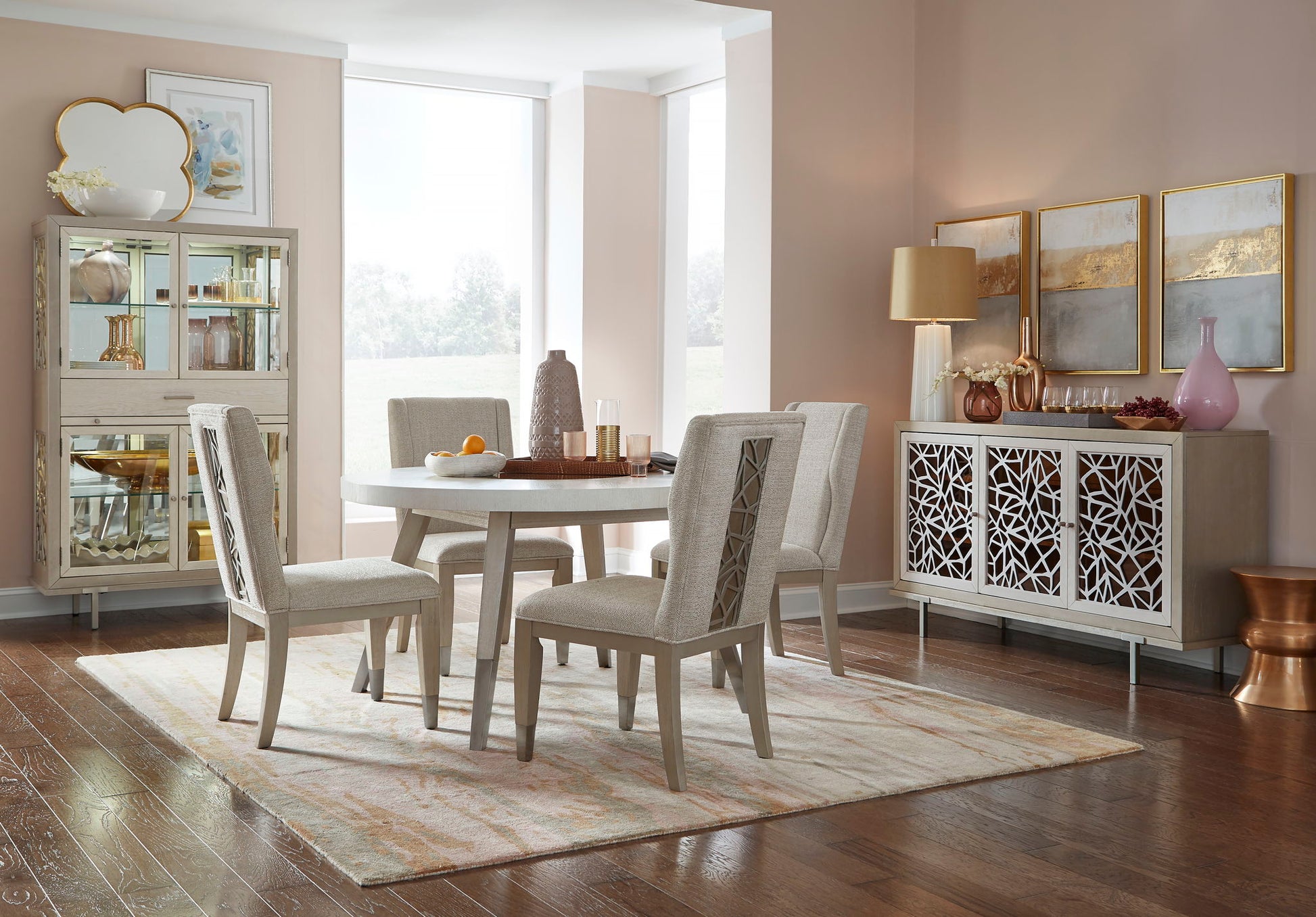 Gracefully-designed with a modern sensibility, the simple contemporary profiles of the Lenox Collection of dining room furnishings come alive with architectural elements and mixed materials including wood, metal, glass and clear mirror. Crafted of Random Width Cathedral White Oak Veneer and Hardwood Solids, Lenox combines the soft Acadia White finish with Warm Silver metal accents and Bronze Glass for a refined and romantic elegant glam. A signature geometric fretwork in the Warm Silver finish appears on the dining chair backs, giving a designer flair to the collection. Metal ferrule caps in the warm silver finish on the dining table, chair and bench legs are a sophisticated touch and complement the Silver Mist hardware. Bring grace and glamour to your home with the Lenox Collection.