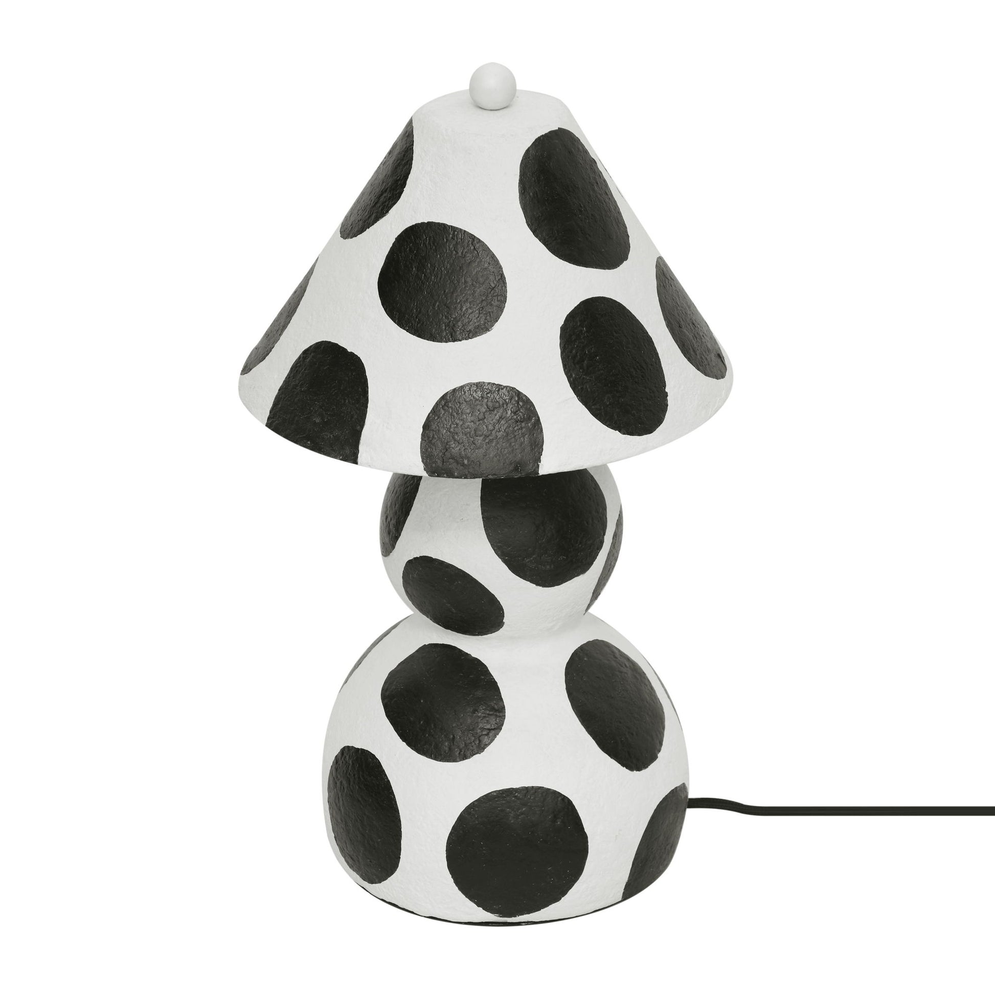 Illuminate your space with the charming Lerici Black and White Papier Mache Table Lamp, featuring a beautifully curvy silhouette crafted from innovative paper mache construction. The lamp's punchy polka dots add a playful touch, complemented by a domed lampshade and an adorable orb finial. This striking lamp effortlessly adds personality to any space, making it a delightful and stylish accent for your home.