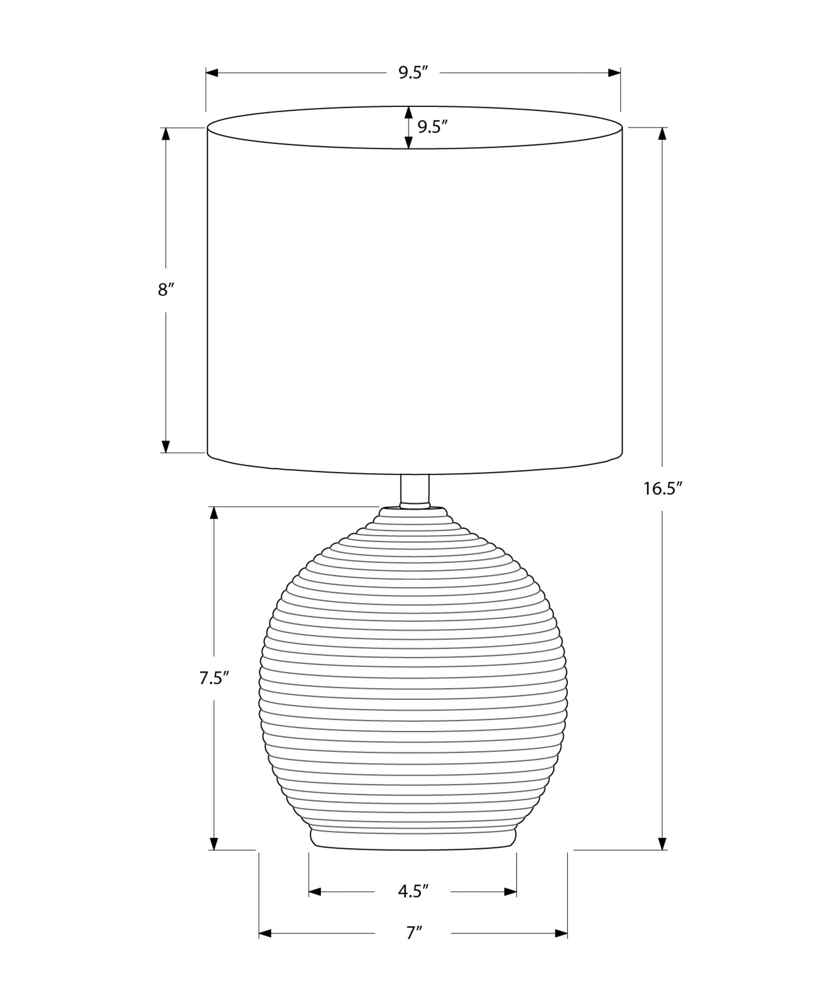 • Product Dimensions: Overall dimensions are 9.5" L x 9.5" W x 16" H with a base of 7" L x 7" W x 7.5" H and a shade of 9.5" L x 9.5" W x 8" H.