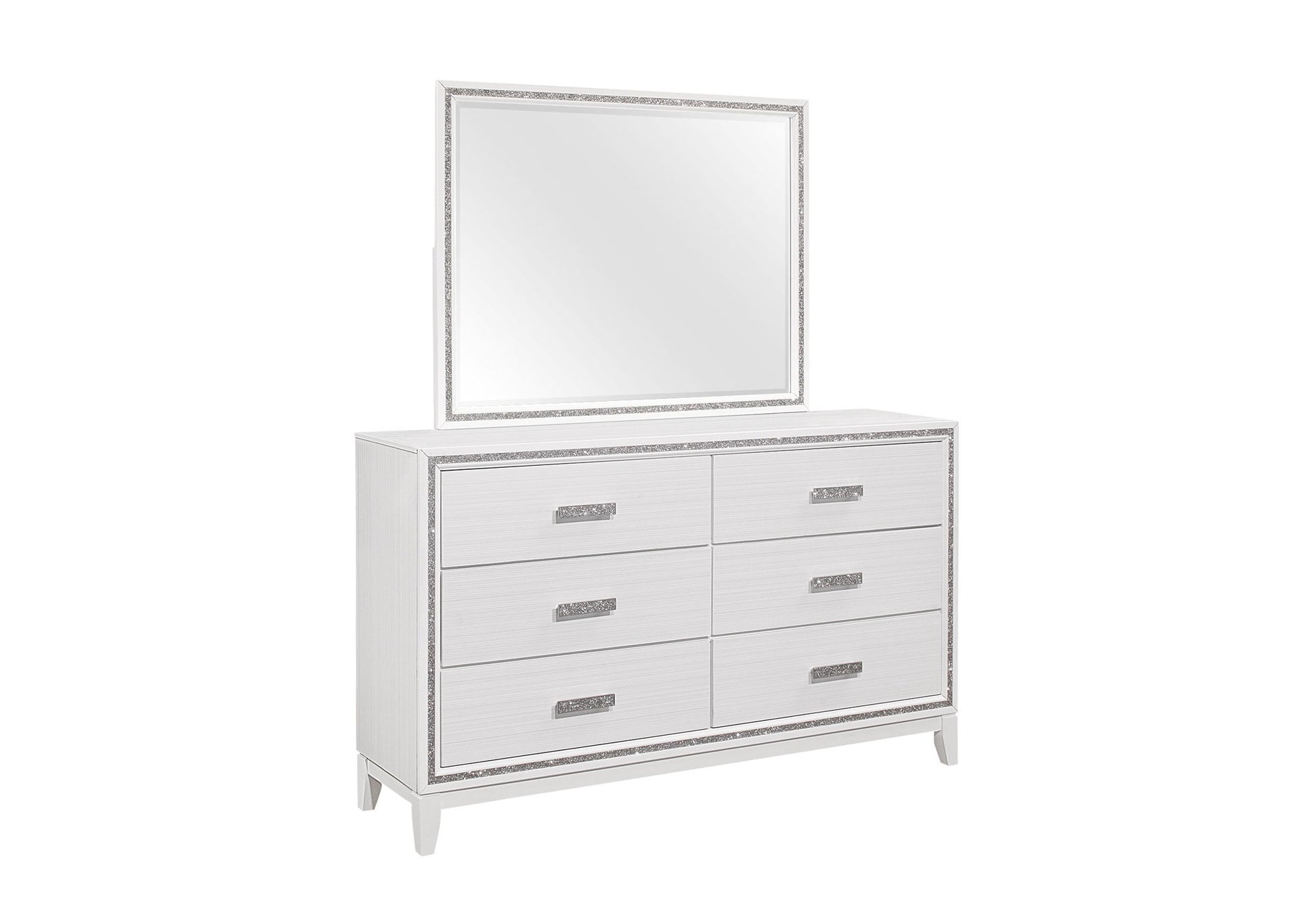 Lily bedroom brings two worlds together. The classic lines and modern accents create a beautiful transitional glam bedroom look. The crushed crystal like look outlines all the pieces along with LED lighting accenting the head board. The crushed crystal like design is not only used as an accent trim but is also carried over to the hardware. The end result is a beautiful glam bedroom.