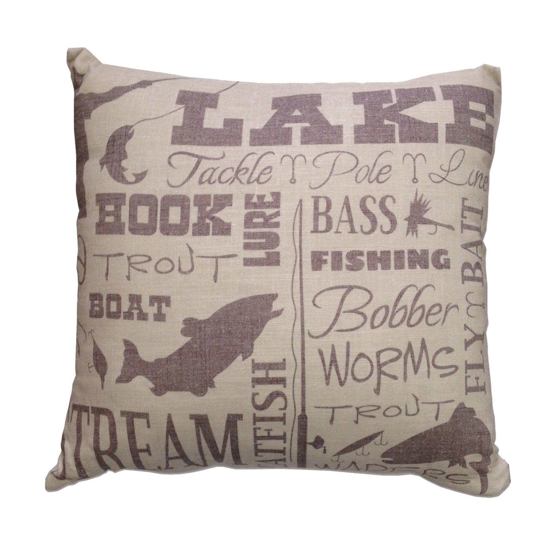 Make the memories of your lake house a little bit closer with this decorative pillow in neutral colors. Various lake and fishing text is printed on the front. What's Included 1 Pillow Dimensions 18"W x 18"L Materials Shell: 100% polyester; Fill: 100% polyester Care Spot clean recommended. Insert included.