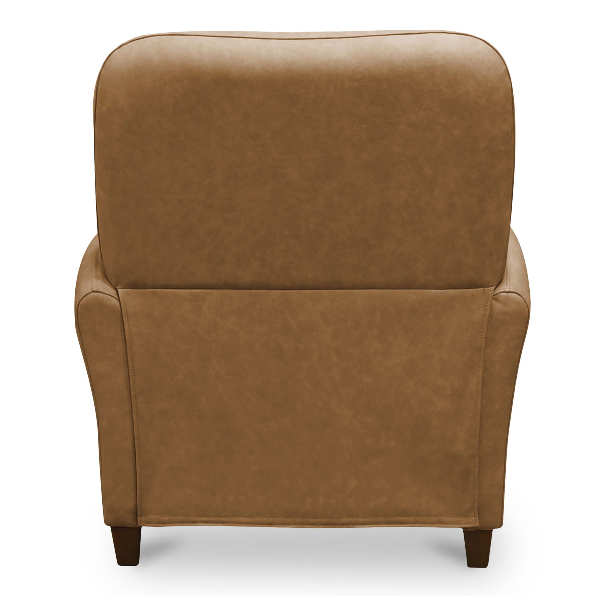 Upholstered in soft textured, lightweight top-grain Brazilian leather, the Luna recliner features a manual push-back mechanism for full reclining over tapered wooden legs. Its transitional style includes gently curved arms, contemporary rounded edges, and sophisticated piping details running along the edge of the arm and seat.