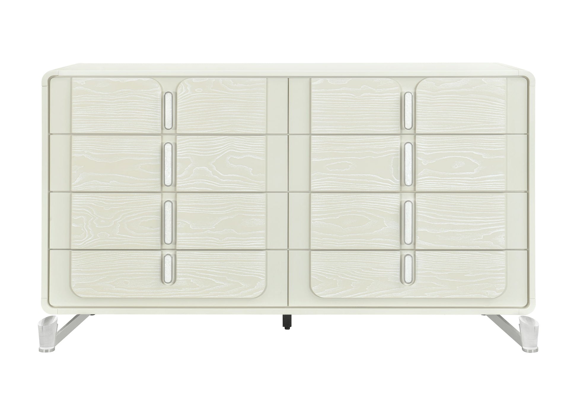 The Lyra Dresser combines sophistication and smart storage. Crafted in a light beige wood finish and elevated by sleek acrylic legs, this dresser features eight felt-lined, full-extension drawers for smooth functionality. Two portable jewelry drawers provide secure and convenient organization, while oval metal handles placed at the center of each drawer add a touch of modern artistry.