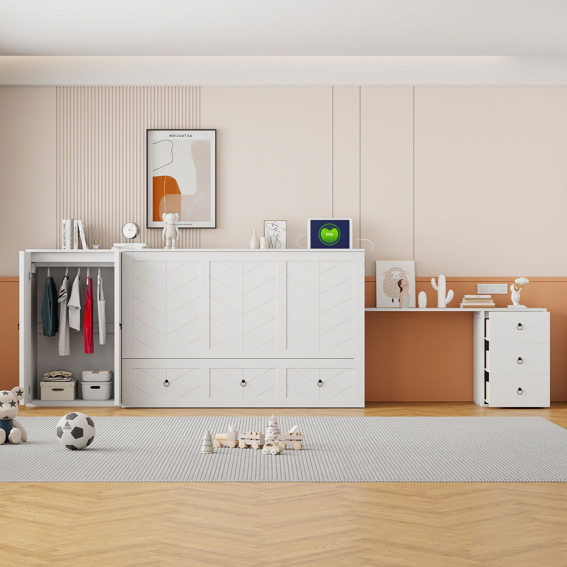 Transform your living space with our versatile Murphy Bed, designed to maximize functionality without sacrificing style. This innovative piece of furniture can seamlessly transition between a spacious cabinet and a comfortable bed, making it ideal for small apartments, guest rooms, or multifunctional spaces.The under-bed drawer offers generous storage, perfect for stowing away clothes, toys, or other belongings. The integrated wardrobe provides a designated space for your garments, while the desk on the opposite side, complete with three large drawers, serves as an excellent work or study area.One of the standout features of this Murphy bed is the built-in dual power/USB module, allowing you to conveniently charge your devices right at your bedside.