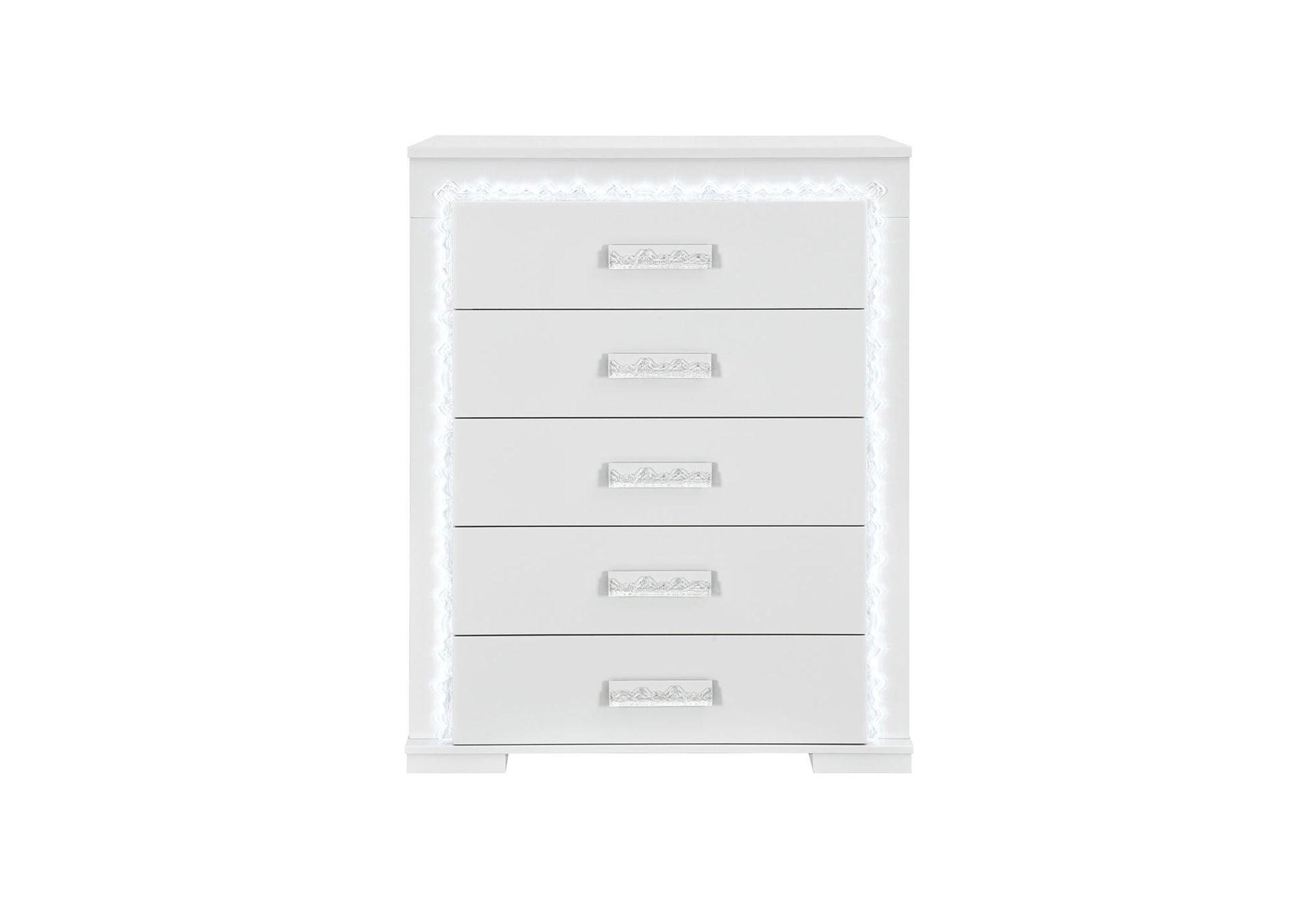 Redefine your bedroom with the sophisticated elegance of the Naomi Bedroom Collection by Global Furniture USA. This stunning set is finished in a soft light grey lacquer, creating a serene and modern atmosphere. The bed features a dramatic faux marble grey headboard with a contemporary silhouette, framed by LED light trim for a soft, ambient glow. Matching case goods e dresser, mirror, nightstand, and chest e all feature the same sleek lacquer finish and LED lighting for a cohesive, designer-inspired look. Thoughtful details like full-extension glides on every drawer ensure smooth functionality, combining modern convenience with timeless style. The Naomi Collection is perfect for anyone seeking to elevate their bedroom into a sophisticated retreat.