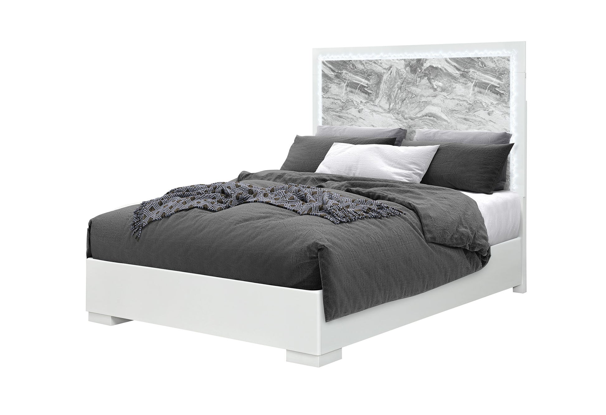 Make a bold statement with the Naomi Queen Bed. The light grey lacquer finish brings a modern, airy feel to your space, while the faux marble grey headboard with LED light trim adds drama and sophistication. The clean lines and contemporary design make this bed the perfect centerpiece for a stylish, high-end bedroom.