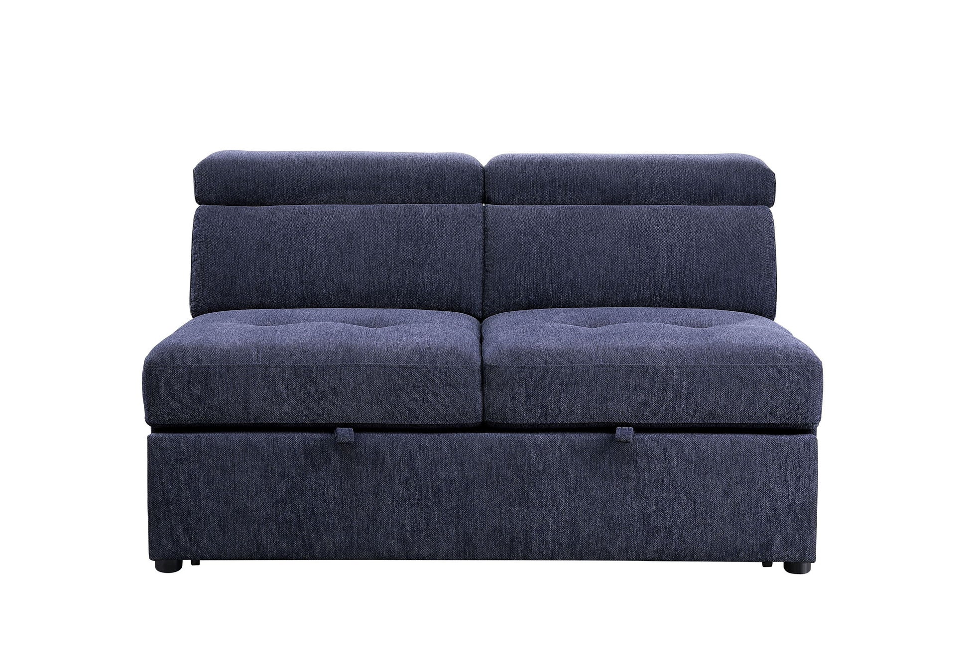 Spend more time with your family on this Nekoda storage sleeper sectional sofa and ottoman. This sofa features adjustable headrests that help elevate the comfort level. Family movie nights are about to be more pleasant with the pull-out bed feature on the loveseat. The button-tufted seat cushions give it a refined look. The chaise and ottoman offer storage to keep blankets and pillows nearby at all times. The navy blue color adds a touch of calmness and serenity. Big enough for the entire family with all the comfort and storage options needed.