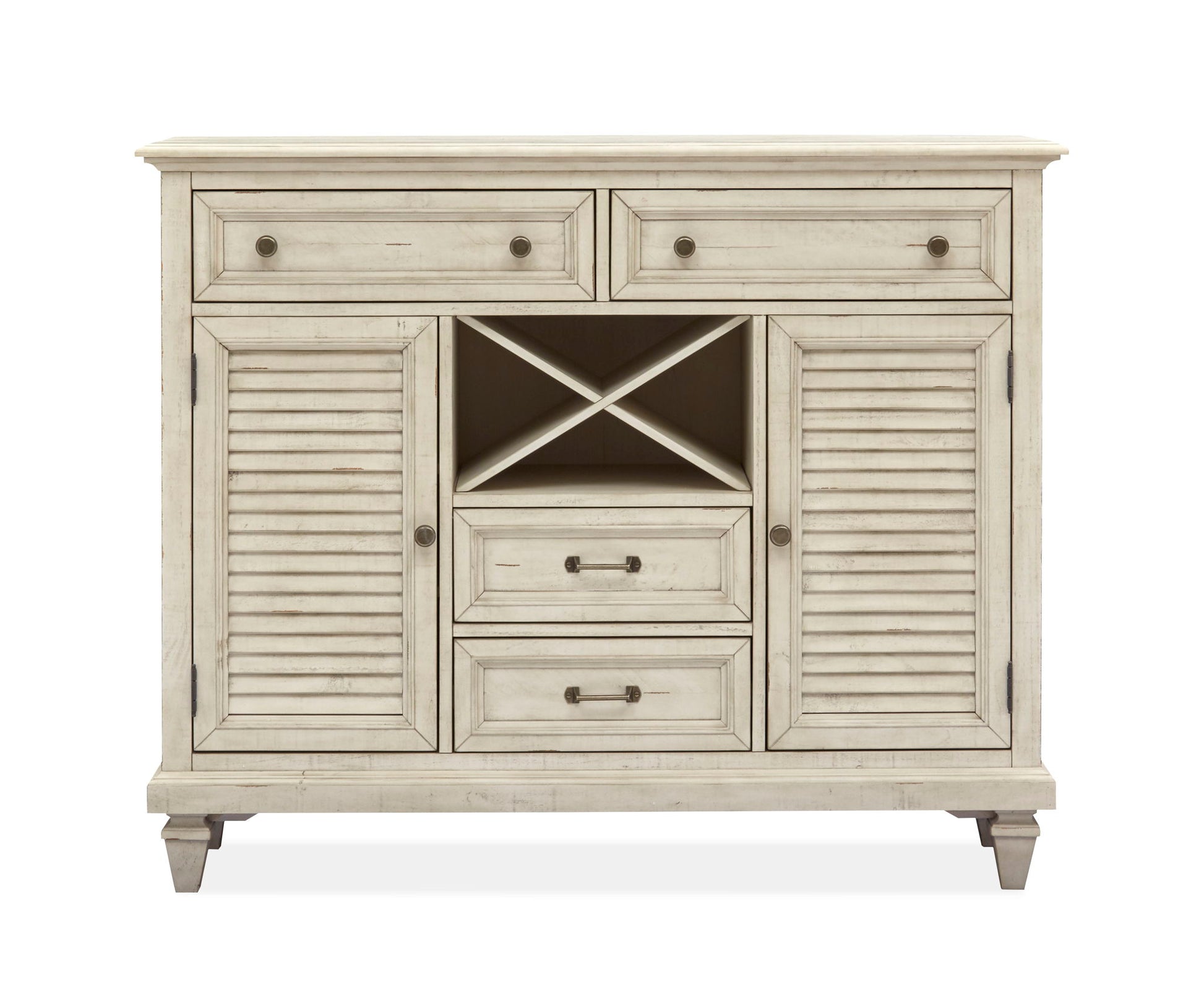 Inspired by the architecture and landscape of California Wine Country, the Newport dining collection exudes the ambience of laid-back luxury. Crafted of high-low Pine and Hardwood Solids, the soft Alabaster finish and Brushed Pewter hardware mix effortlessly with graceful turned legs and designer details to create a look that is bold yet inviting. Adding a casual classic and coastal resort flair, shutter wood doors are used on the server, and two shutter doors are also on the base of the counter table, with adjustable shelves behind. The distinctive piece selection includes a buffet, server and a dining cabinet with two wood-framed glass doors on the top and two on the bottom, offering 3-way touch lighting control with 2 LED lights. The table options include a 52-inch round and a 68-inch rectangular leg table. The tables can be extended to 70 inches and 86 inches, respectively, with use of a leaf. The rectangular counter table extends to 58W x 36H when the butterfly leaf is used. The versatile seating options include a side chair with upholstered seat and wood slat back, an upholstered seat and back chair, a bench with upholstered seat and wood trim, an elegant shaped chair with wood trim and upholstered seat and back, and counter-height dining chair with upholstered seat and slat back. Relax and unwind as you anticipate your favorite decision of the day: whether to open red or white.
