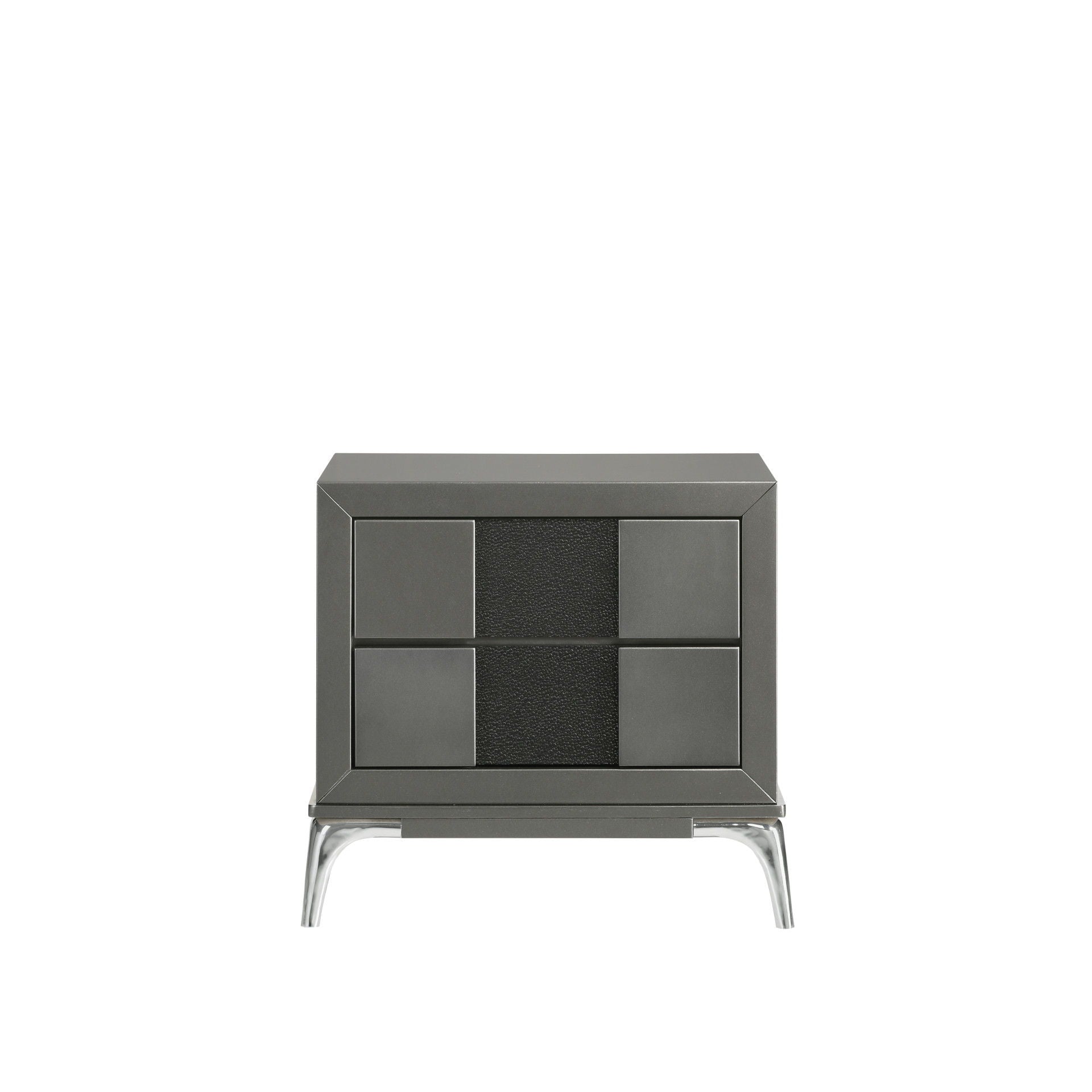 Discover the Nocturne 2 Drawer Nightstand, a testament to modern design and functionality. Constructed with the robustness of Rubberwood solid wood and the finesse of Okoume veneers, this nightstand promises durability and a touch of elegance. The slate gray finish, with its subtle sheen, harmonizes with textured charcoal accent panels, offering a visual and tactile experience that complements any bedroom decor. The drawers are a highlight, gliding effortlessly on ball bearing slides, and their interiors are finished to perfection, ensuring your belongings are housed as beautifully as they are accessible. With two spacious drawers, this nightstand offers ample storage for all your bedside necessities. The silver legs add a final touch of sophistication, anchoring the piece with a contemporary flair that is both striking and practical. This nightstand is not just a piece of furniture; it’s a seamless blend of style and utility, designed to enhance your living space.