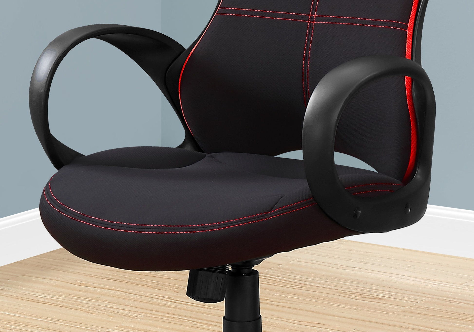 • Design and Material: This gaming-style office chair features a high-back design with fixed, rounded armrests. It is crafted from a polyester-blend fabric in black with striking red accents, providing a modern and contemporary look.