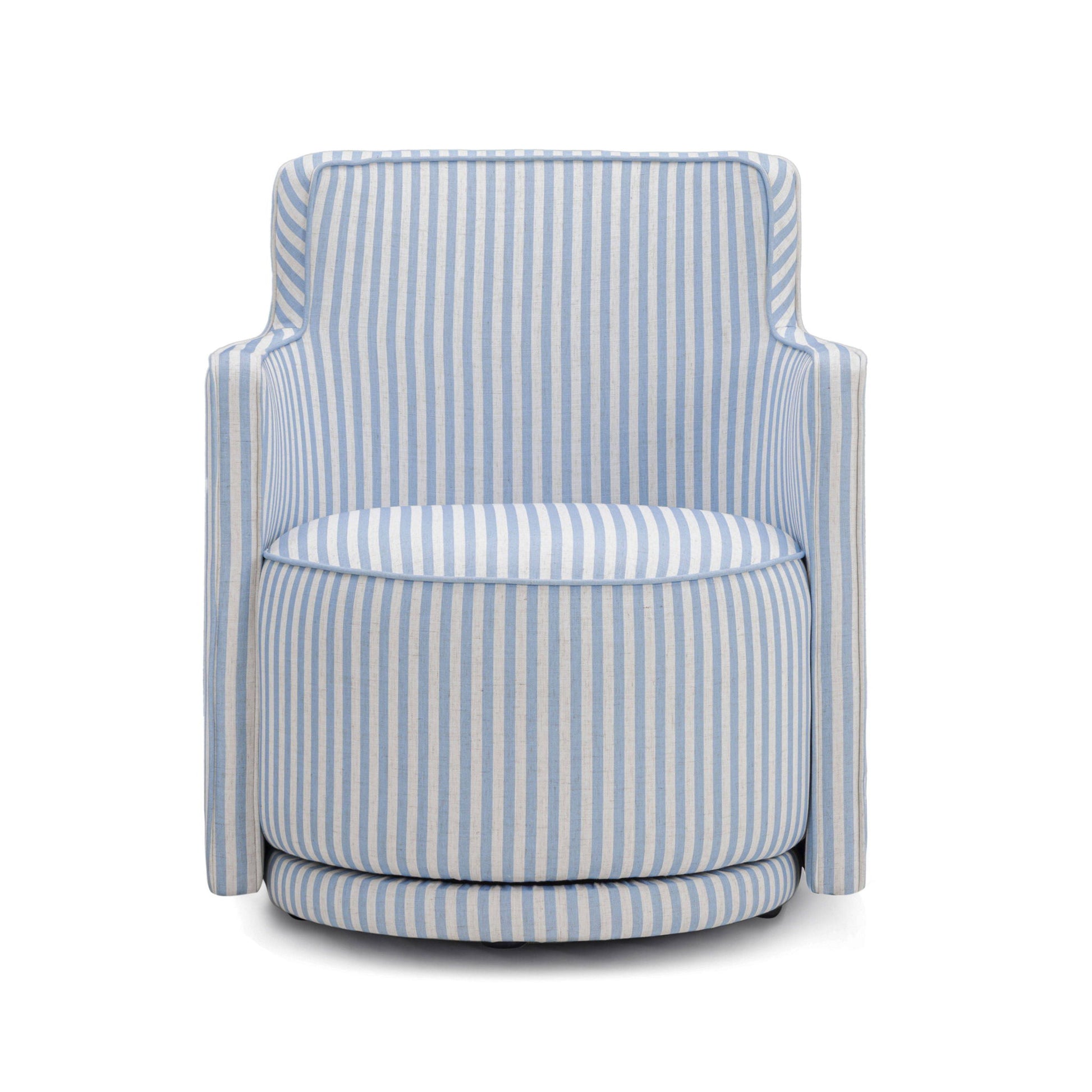 The Passe Swivel Accent Chair combines timeless design with everyday comfort. Fully upholstered for a cozy feel, it is available in a range of fabrics to suit any style. Choose a striped linen blend in multiple colors for a classic, airy touch, a soft textured jacquard for understated elegance, or an eco-friendly upcycled fabric crafted from recycled plastic bottles for a sustainable statement. Its smooth swivel base makes it as functional as it is stylish, bringing effortless versatility to living rooms, bedrooms, or cozy reading corners