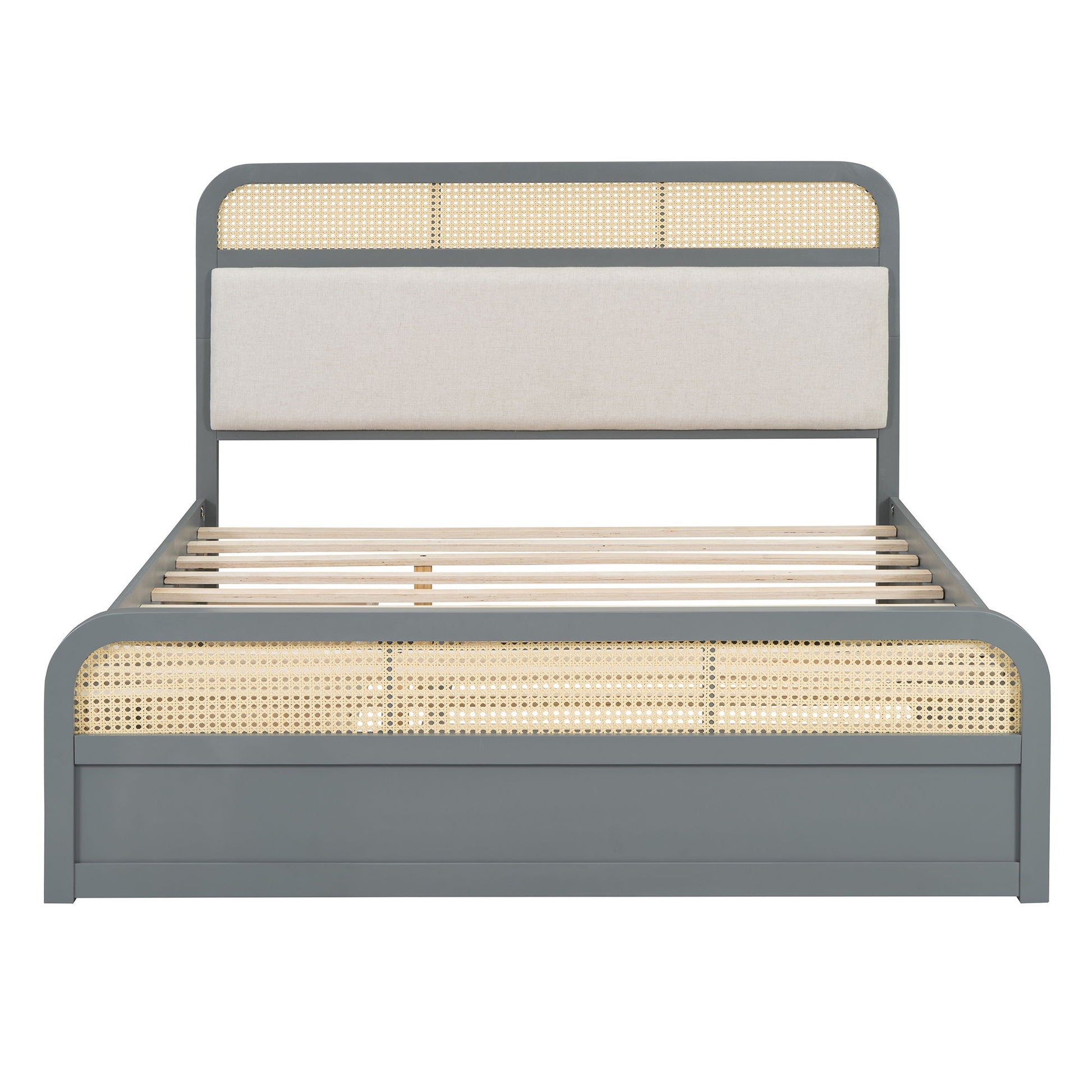 With tasteful rattan accents on both the headboard and footboard, this platform bed adds a touch of classic charm and sophistication to any decor, making it a stylish focal point in your home. The platform bed includes a twin-size trundle bed, which easily pulls out to accommodate overnight guests or provide additional sleeping space when needed. Equipped with two large drawers, this platform bed ensures ample storage for linens, pillows, and other essentials, helping you keep your space organized and clutter-free. The headboard comes with a plush, padded cushion, providing you with a cozy spot to lean back and relax whether you’re reading or unwinding.