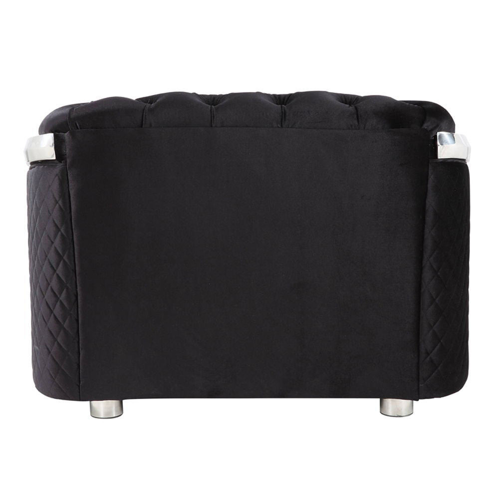 A classic chesterfield design with a modern twist, the Pyroden collection can work in both modern and traditional decor. Both glamourous and cozy with their overstuffed cushions and button-tufted backrest and arm. The outer body is accentuated with diamond stitching to give them more pizzazz. The metal trim is a contemporary feature that makes the black velvet stand out.