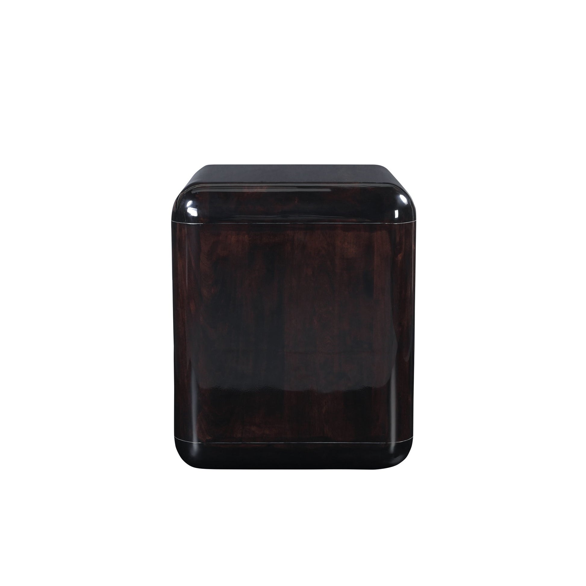 • A high-gloss nightstand with rounded corners that add softness to its boxy shape