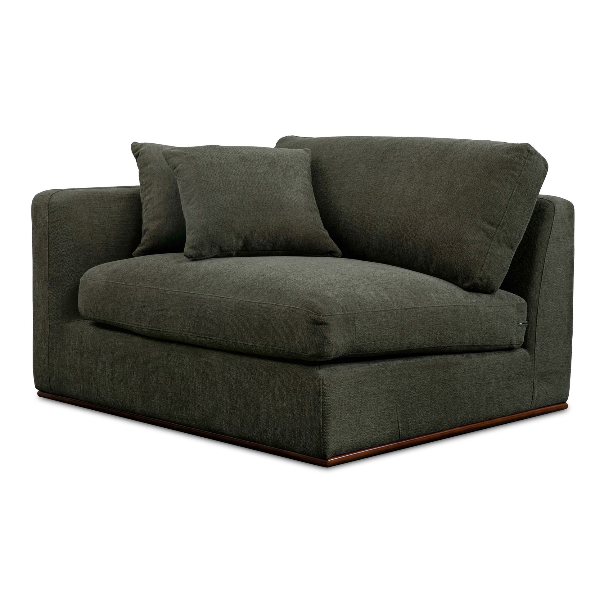 The Rue chair features a generous 70% feather-fill topper within its seat, accompanied by two toss cushions for an added layer of coziness. Its elegant silhouette is highlighted by a rubber wood base, creating a sleek floating appearance, all supported by subtle wooden legs. Designed with extreme comfort in mind, this modular chair embodies easy, neutral styling.