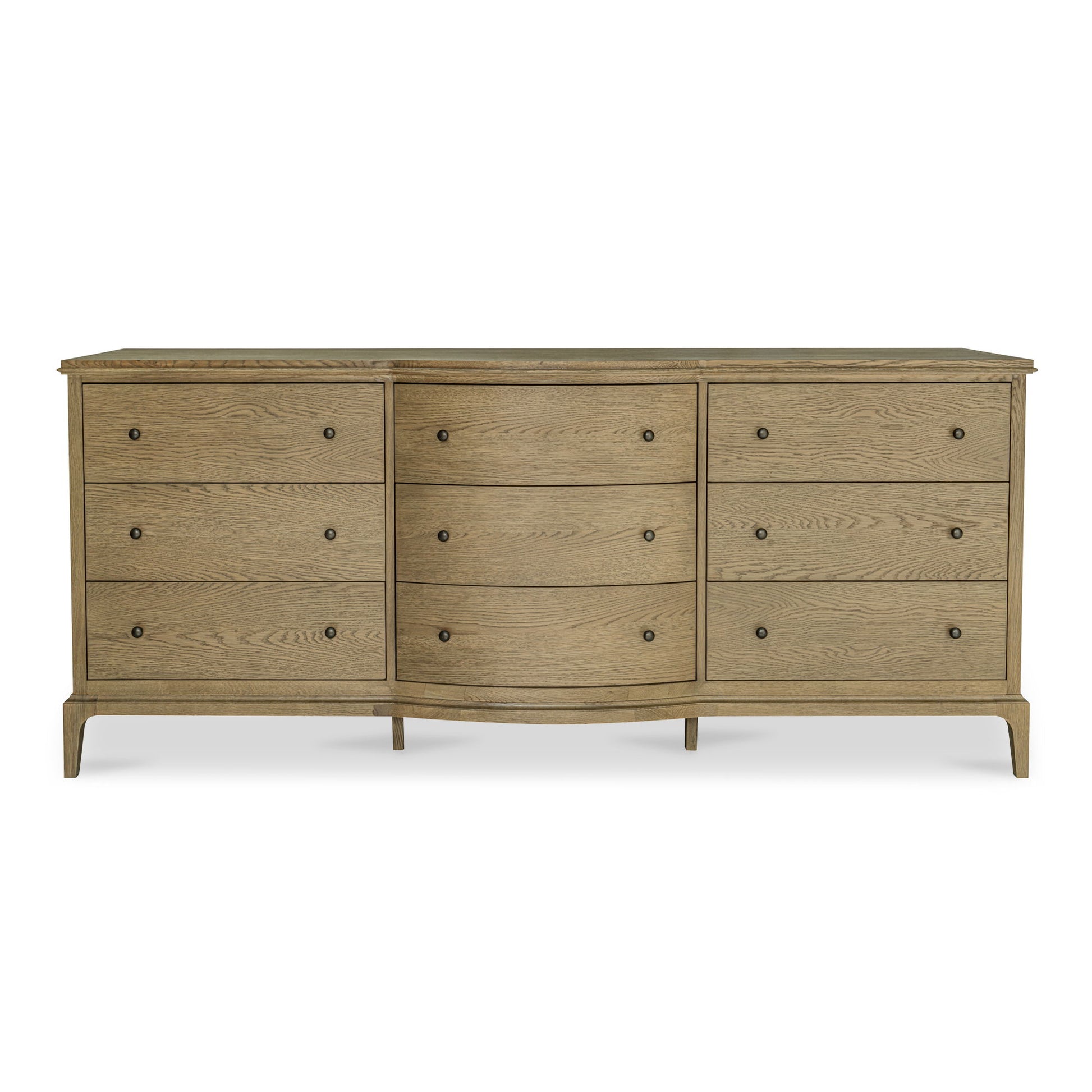 • Overhang with rounded edges is a simplified modern detail on top & base, curved front. Curve on the middle set of drawers brings a softness to the bedroom