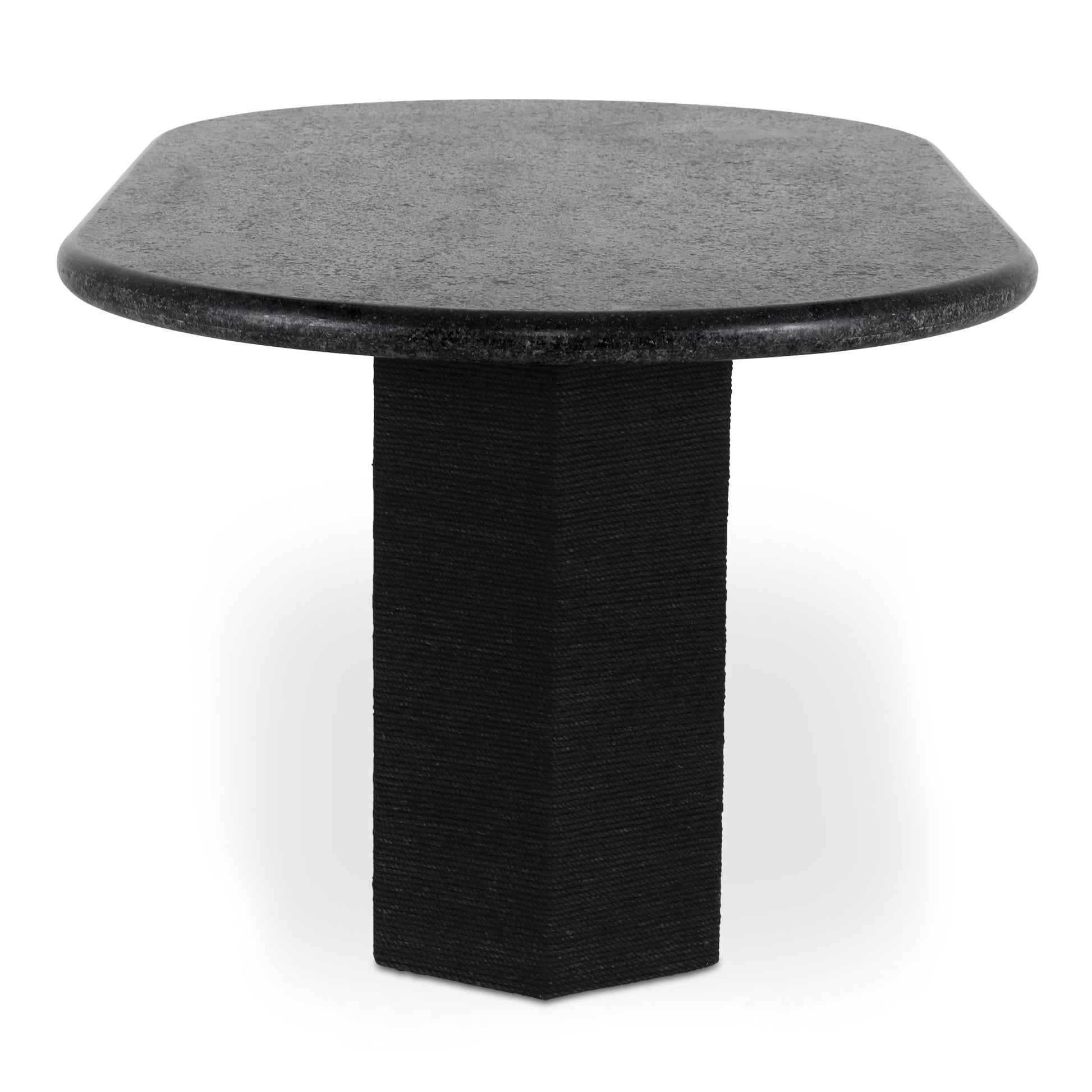 Gillian Segal for Moe's The Sartoria dining table invites conversation and collaboration. Its thick bullnose edge top is crafted with black granite, a reinterpretation of an older material into a weathered finish with a European feel. A jute-wrapped pedestal base complements the vibrant top for a touch of organic texture, function, and support for its smooth, inviting form.