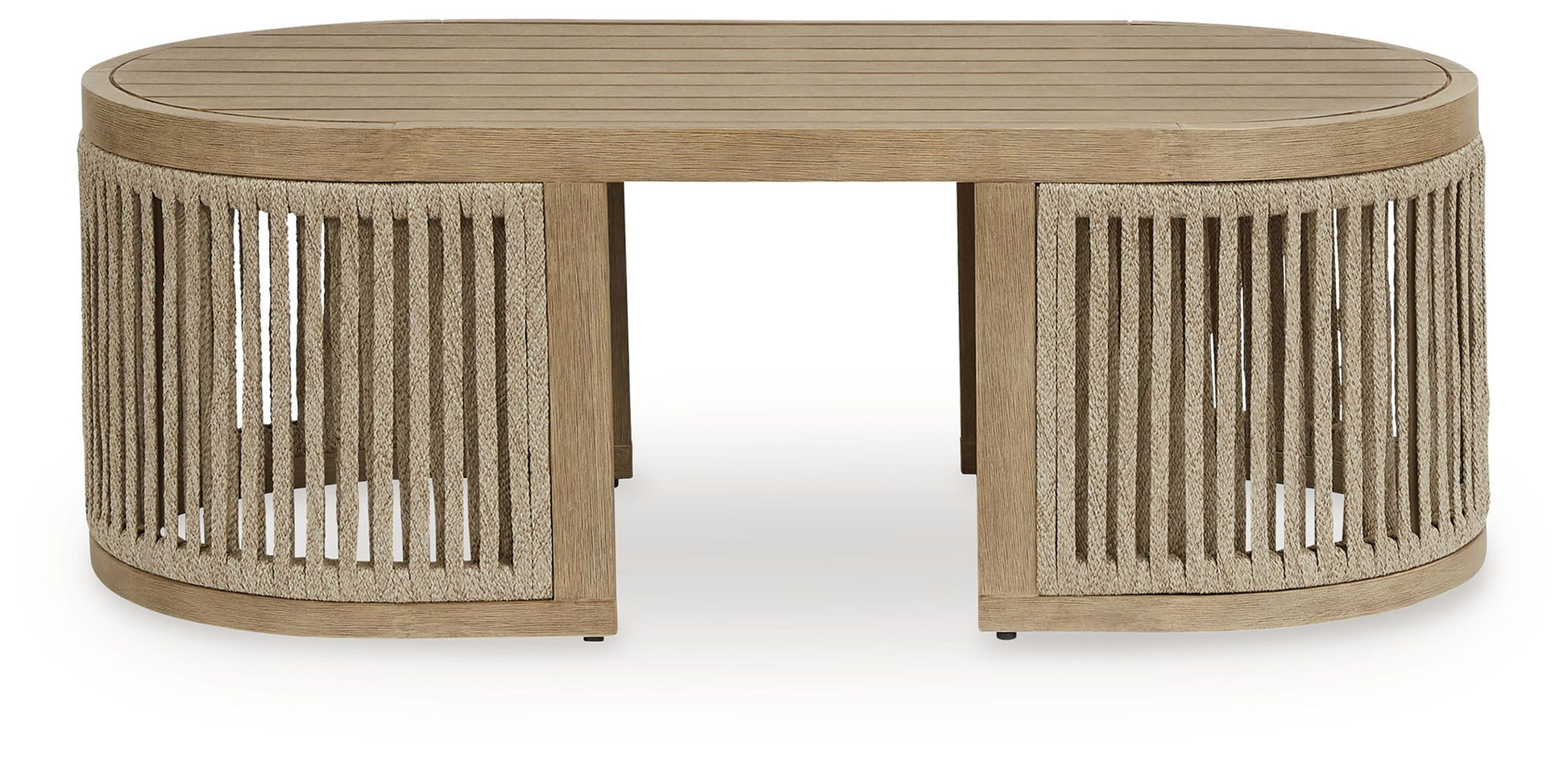 Round out your outdoor living space with the naturally beautiful look of wood. This coffee table will serve up seasons of relaxation on your back deck or sitting pretty by the pool. A gently curved open-weave design, crafted from eucalyptus wood and polyester rope, is the perfect merger of high fashion and lasting durability. It's just the spot for sips and snacks.