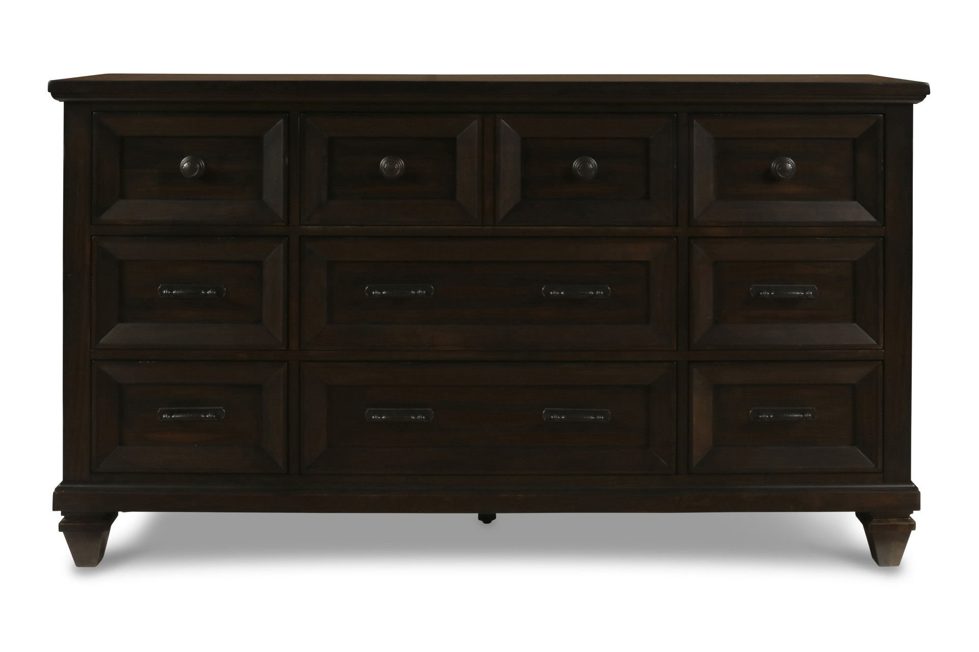 The Sevilla 9-Drawer Dresser in walnut is a masterpiece of timeless craftsmanship and versatile design, making it a stunning addition to any bedroom. Skillfully crafted from solid Acacia wood and Acacia veneers, this dresser features a rich, hand-distressed walnut finish that gives it a warm, vintage appeal. The dresser's sturdy construction and substantial presence command attention, while its elegant design blends traditional, rustic, and colonial styles, creating a cozy and inviting ambiance. The nine spacious drawers are equipped with masterful dovetail joinery and smooth interiors for snag-free storage, gliding effortlessly on precision-engineered, full-extension drawer glides. Thoughtful details include luxurious velvet-lined top drawers to protect your valuables and a removable jewelry caddy nestled in the top center drawer, adding both elegance and functionality. Perfectly balanced between style and durability, this dresser serves as a captivating focal point in any classic, cozy, or historically inspired space.