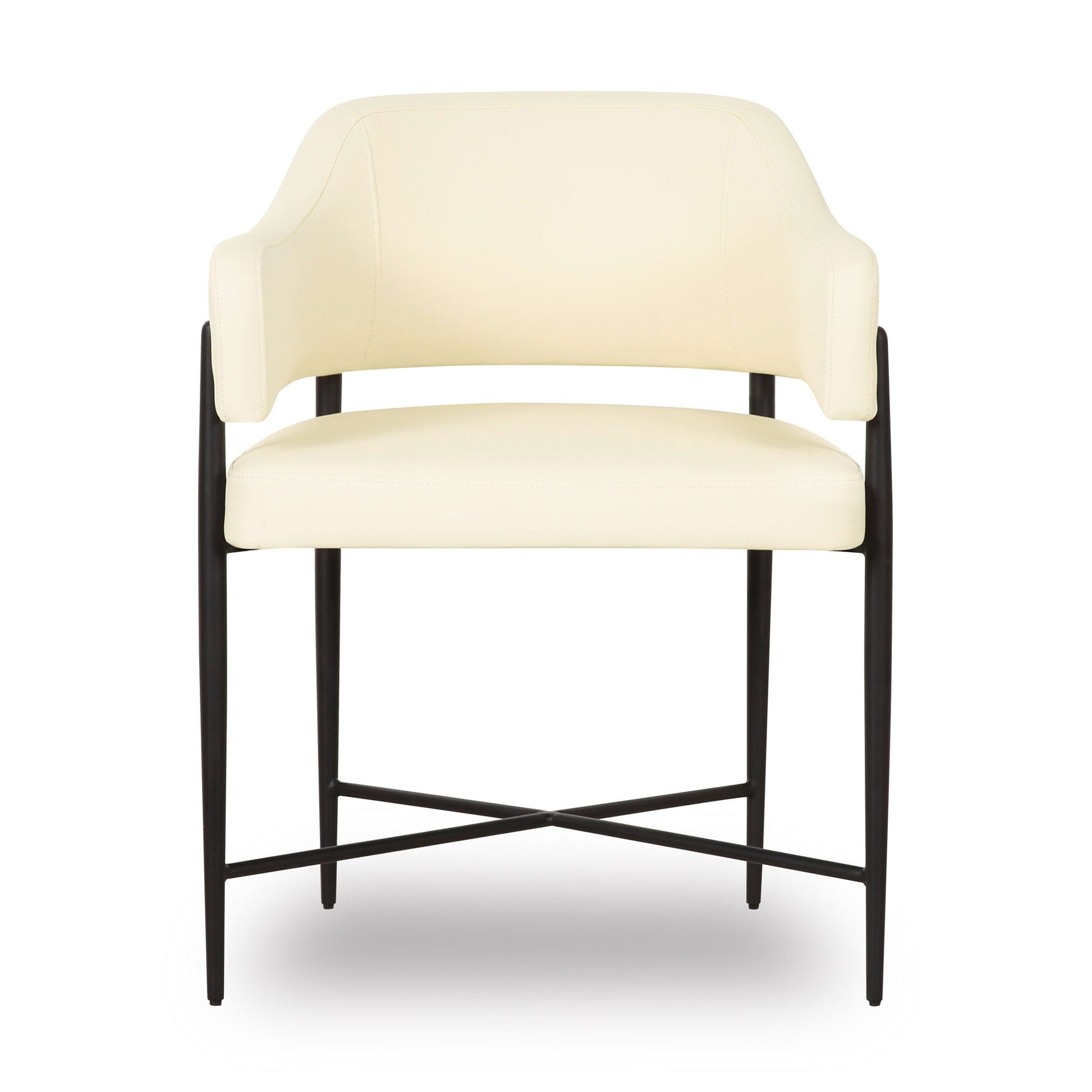 Transform your dining space with the stunning Sezanne Dining Chair, offered in Cream Textured Boucle, and Cream or Tan Vegan Leather. Featuring a black iron finished metal frame, this art deco-inspired chair combines artsy flair with modern usability, offering excellent comfort and a polished look that complements any trendy dining room. The highly textured, liquid-repellent fabric and easy-to-clean vegan leather make it as practical as it is stylish.