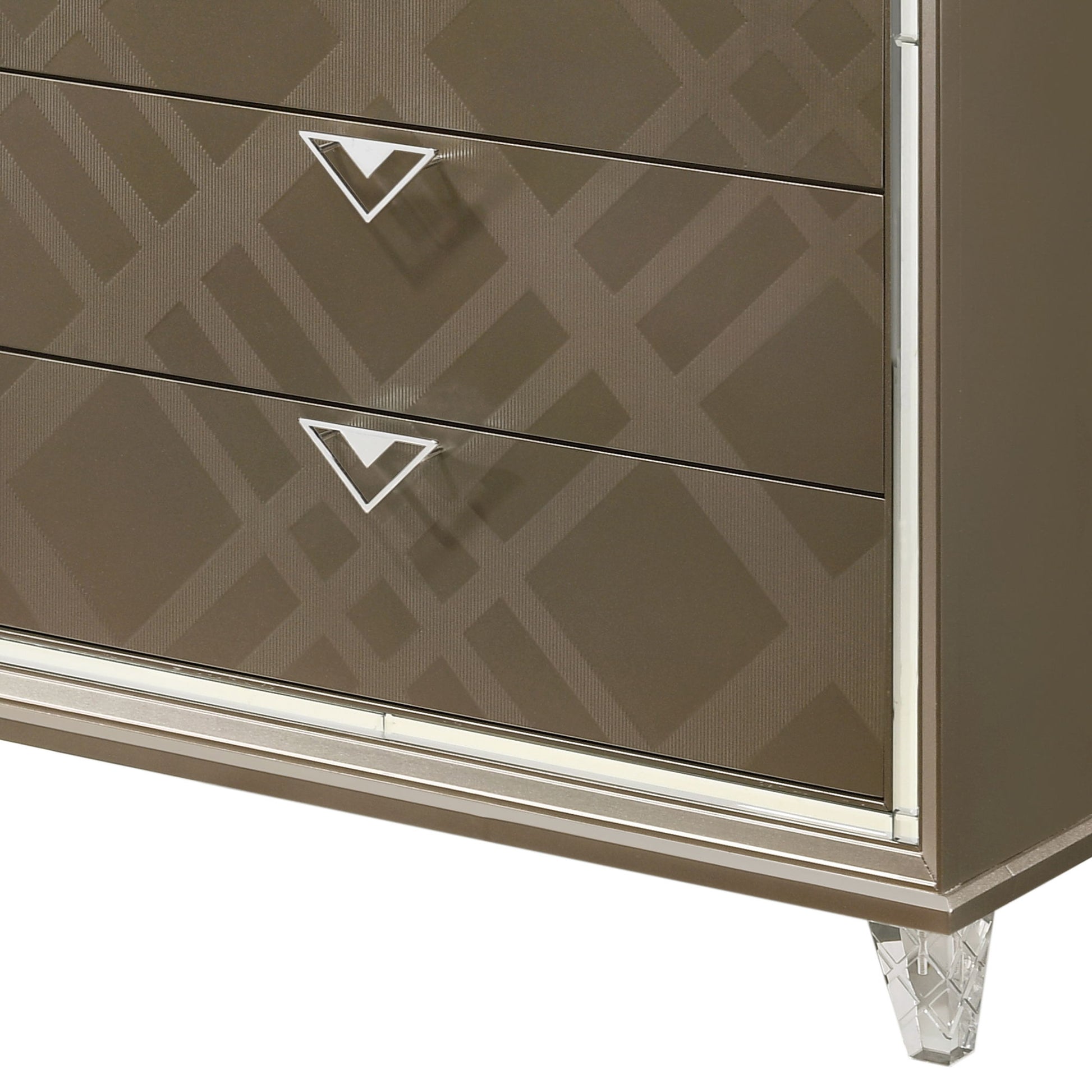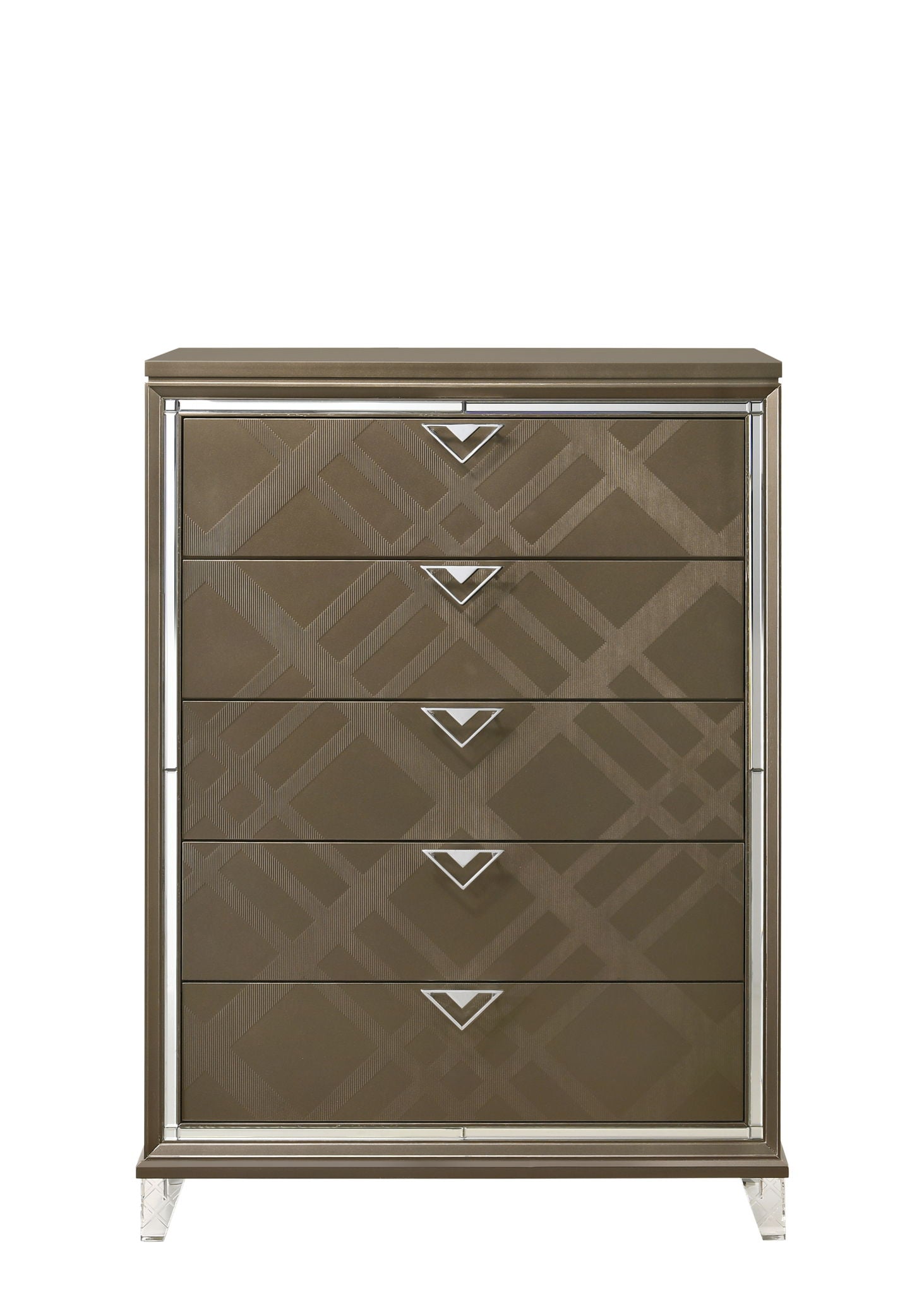 • Elegant Design: This sophisticated 5-drawer chest combines elegance with functionality, featuring embossed fronts that add subtle texture and depth to the design.