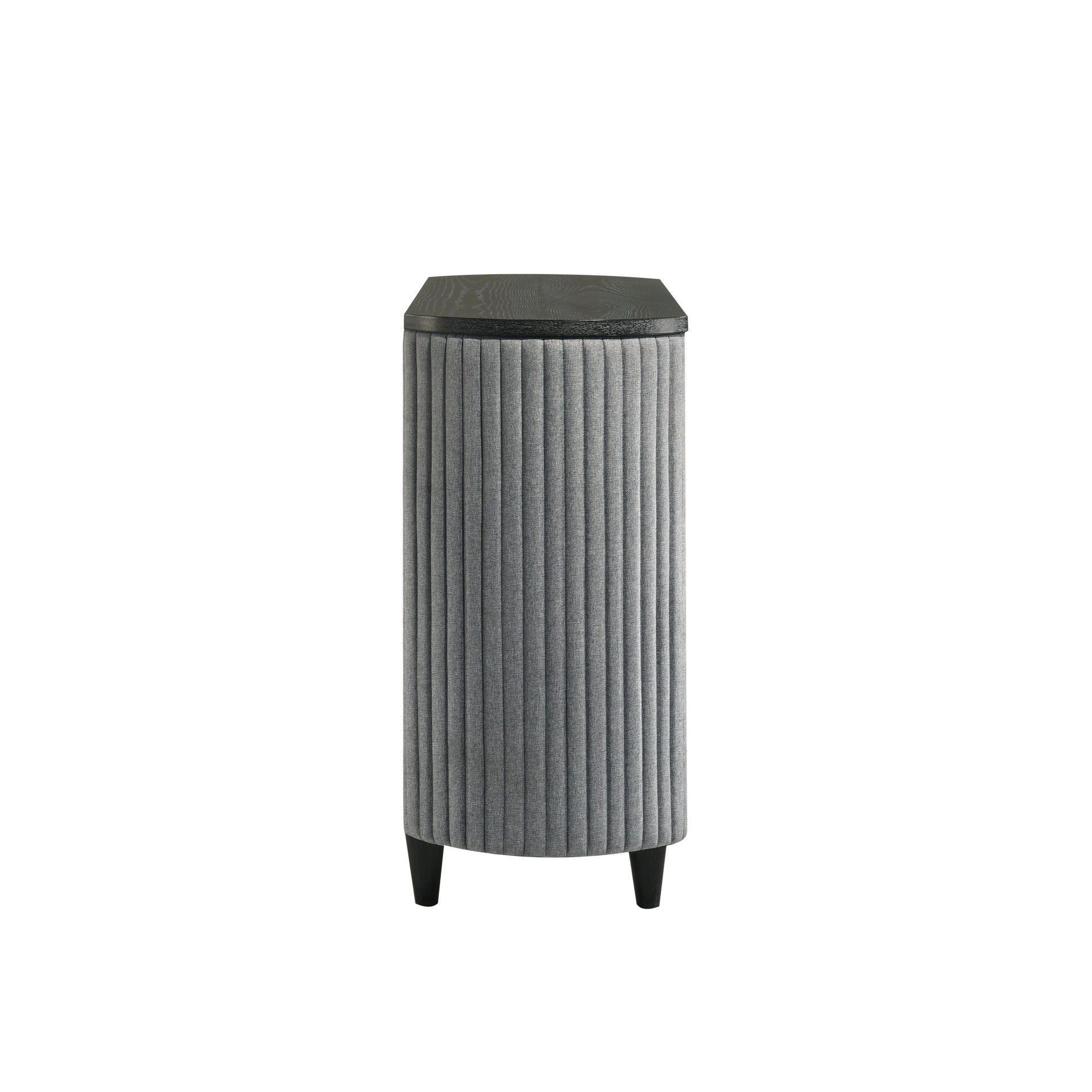 • Mixed Material Mastery: Textured gray ribbed fabric curves around each side of the chest, creating a striking contrast against the dark wood finish, adding visual intrigue while softening the overall look.