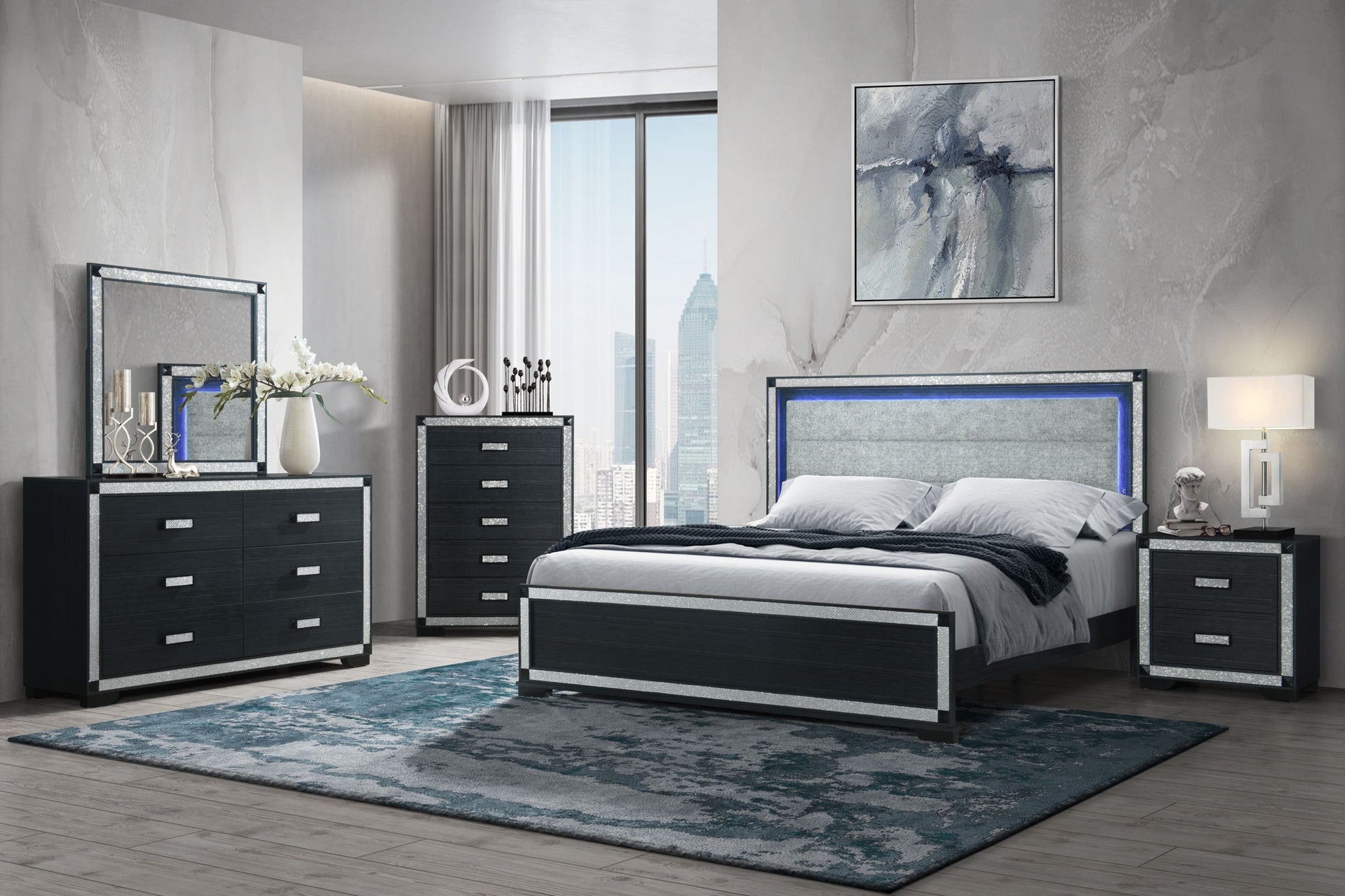 Transform your bedroom into a glamorous sanctuary with the Soleil Bedroom Collection by Global Furniture USA. Finished in a rich dark charcoal, this striking group is designed to make a statement. The centerpiece is the queen bed, featuring a plush grey upholstered headboard framed with glittering silver crushed crystal trim and accented with integrated LED lighting for a soft, elegant glow. Every case piecefrom the dresser to the chestis encased in the same dazzling crushed crystal trim, including matching crystal-accented handles, creating a cohesive and luxurious aesthetic. Soleil brings together rich textures, modern design, and sparkling details, elevating your space into a high-end retreat.