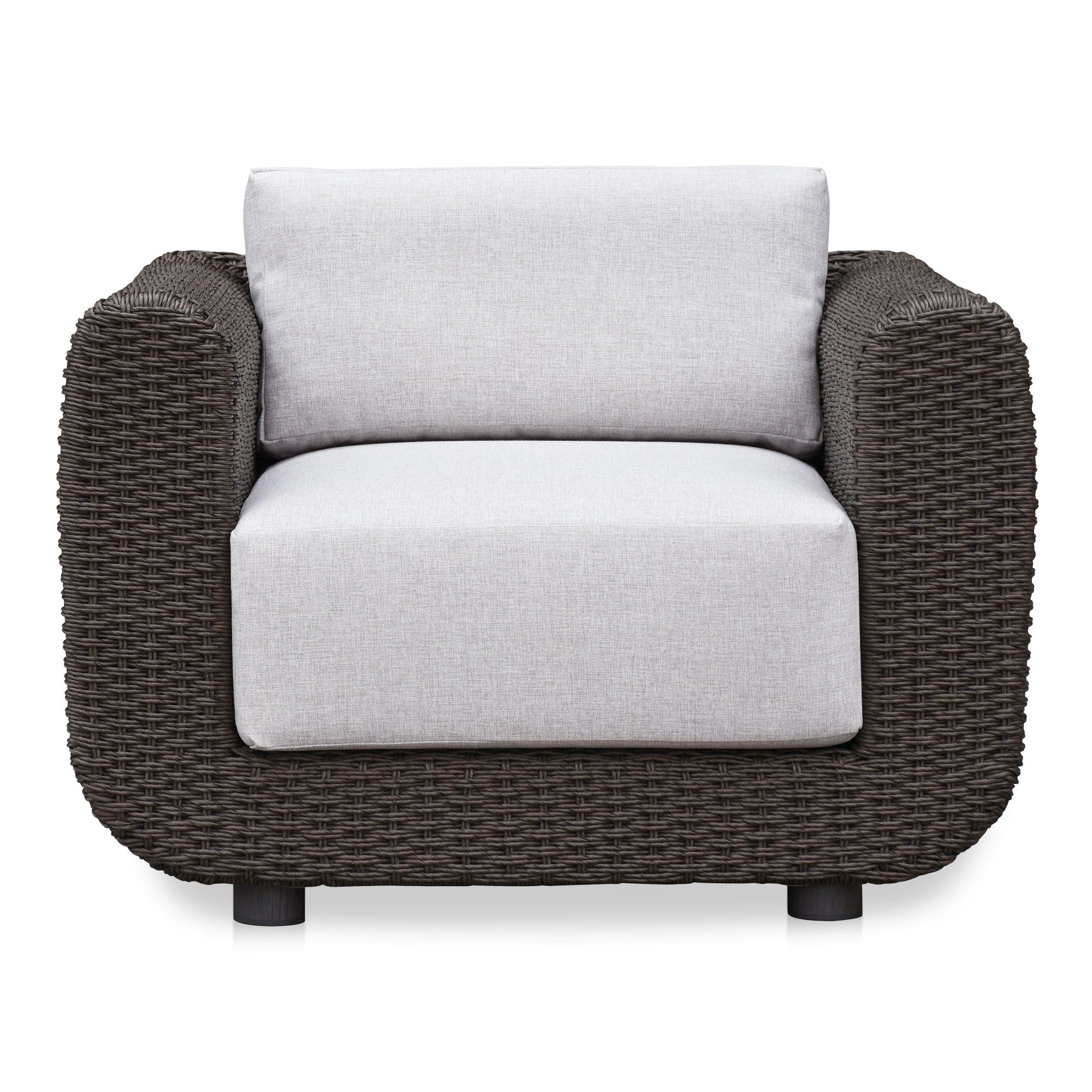 The Soma outdoor accent chair finds a graceful interplay of form and purpose. Its dark brown finished PE synthetic wicker frame and sunproof, heathered Olefin fabric cushions exude poise and durability. Curved, playful arms and quick-dry foam invite relaxation while ensuring timeless panache.