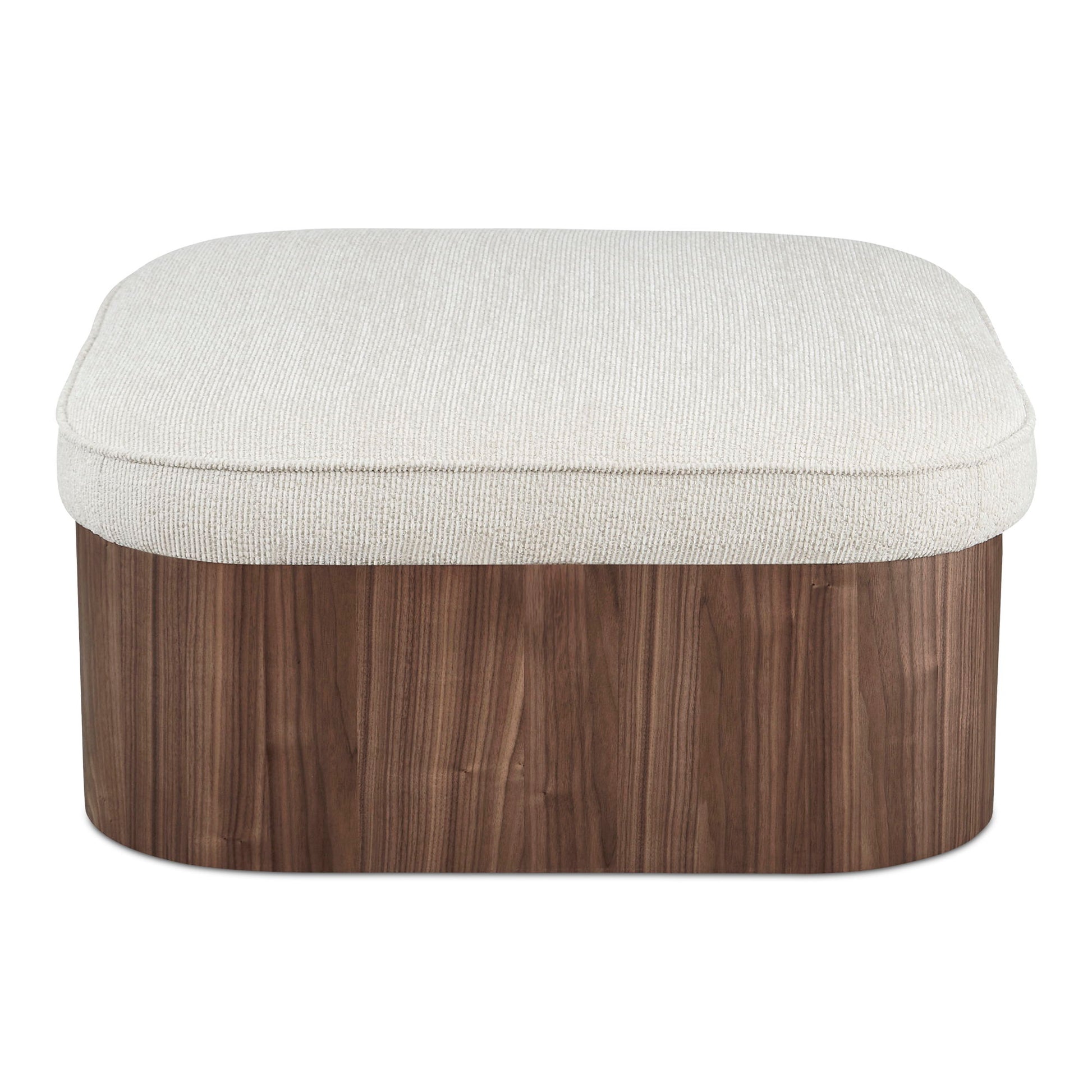 The Sonny ottoman elegantly articulates the luxury of simplicity with a walnut veneer base and a hydraulic lift top that unveils discreet storage. Upholstered in flecked oatmeal fabric, the plush seat contrasts the wood's solid nature with piping that traces its contours. Curved corners soften the ottoman’s silhouette, creating a serene yet functional piece.