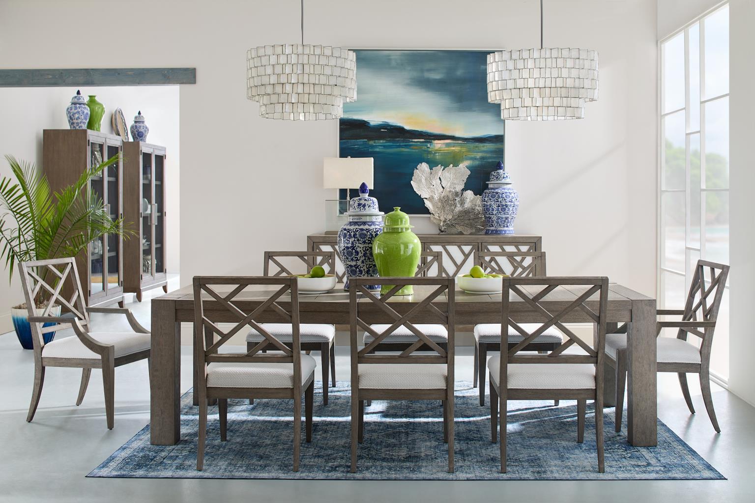 Updated coastal point-of-view can be used by the beach,, down the shore,, at the lake,, or wherever your Staycation takes you. Quartered White Oak takes on dramatically different feels depending on which of the finishes you choose. Painted linen drawer fronts and accents add texture and are also used as backing and under fretwork. Clean,, contemporary brushed nickel hardware nicely offsets the natural finish tones of Haven and Driftwood. Box-on-stand design adds unique depth and dimension to the cases. Beautiful Chippendale inspiration is evident across the fretwork.