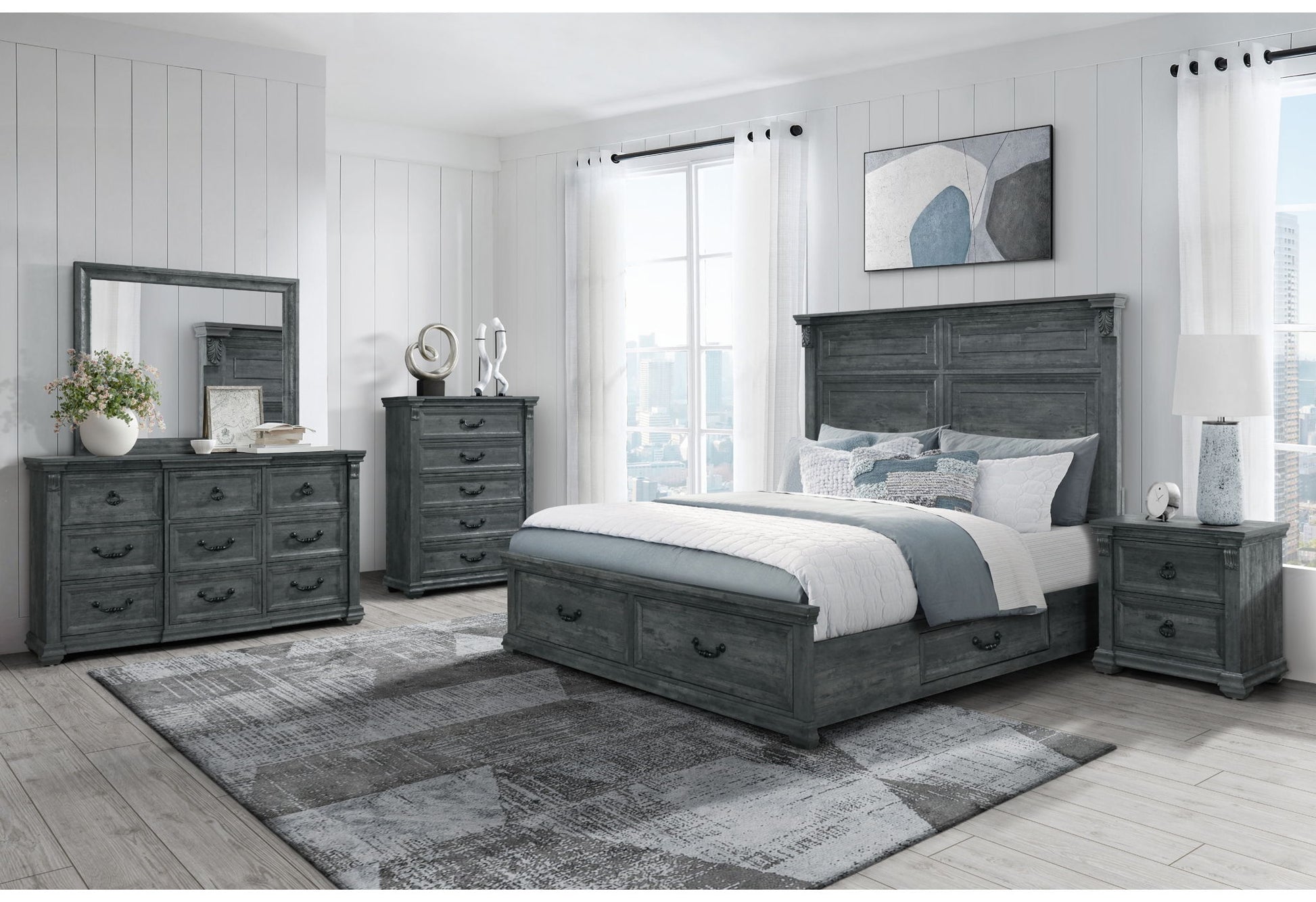 The Tatum Bedroom Collection is crafted with a rustic wood finish available in natural or grey, this classic collection boasts intricate trim, rustic drawer hardware, and elegant scroll work on every piece. The large panel headboard on the bed adds a grand touch to your bedroom. The footboard storage enahnces the functionality of the Tatum set maximizing the benefits.
