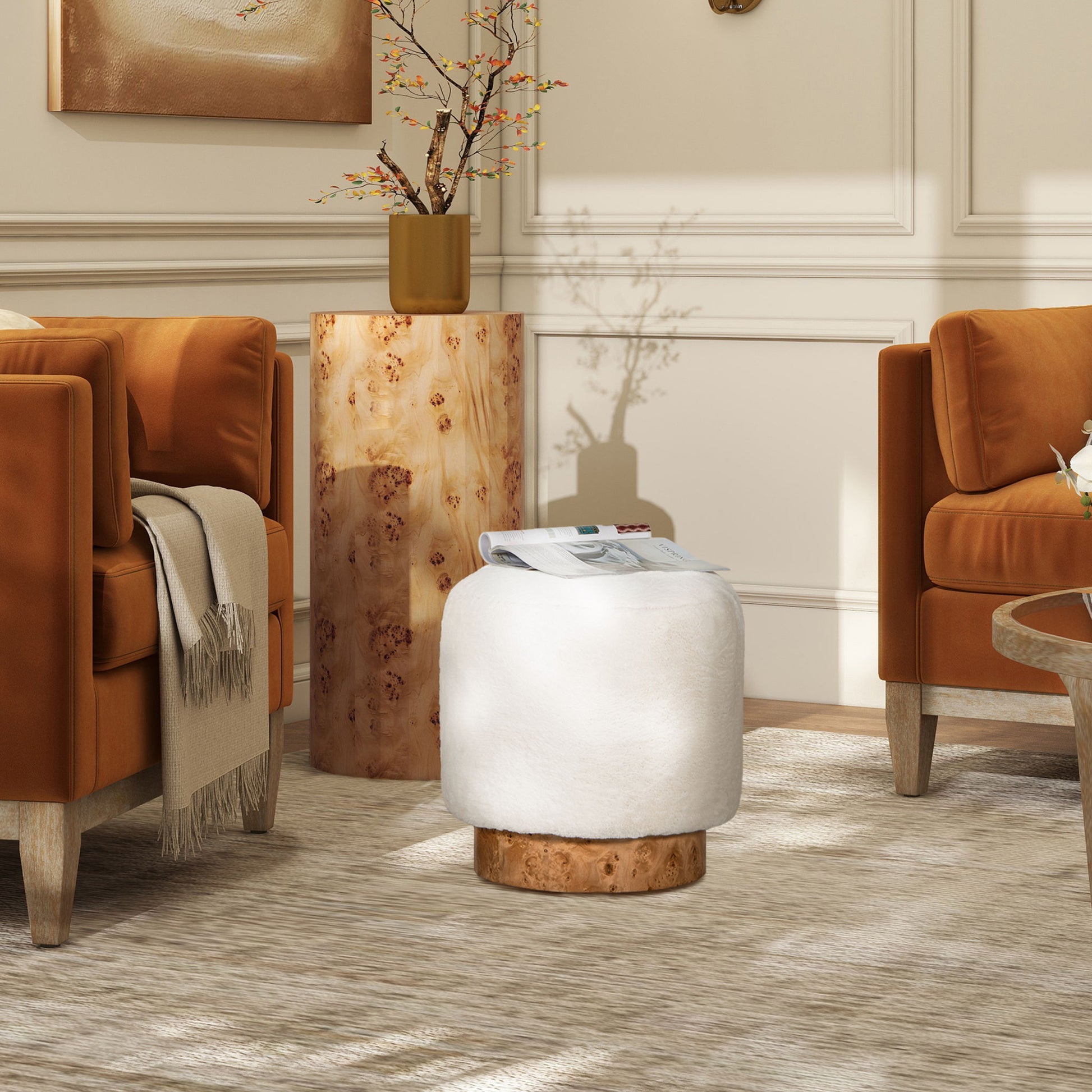 Tilly - Round Fur Upholstered / Burl Pouf Ottoman - White