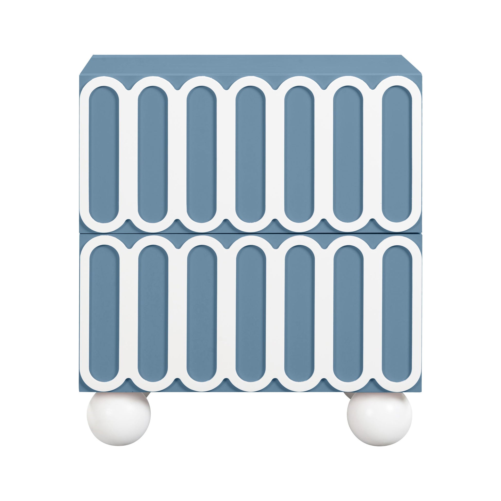 Say goodbye to a boring bedtime routine with the Tori Motif Nightstand, available in dreamy mauve or blue and sophisticated taupe, each featuring a statement-making facade that truly pops. Its solid wood, spherical legs infuse a sculptural Hollywood buzz, while the medium sheen on the surfaces delivers just the right amount of drama without fussy maintenance. Plus, the nightstand's drawers glide smoothly on soft-close rails, ensuring you keep the morning peace, not waking your partner as you start your day.