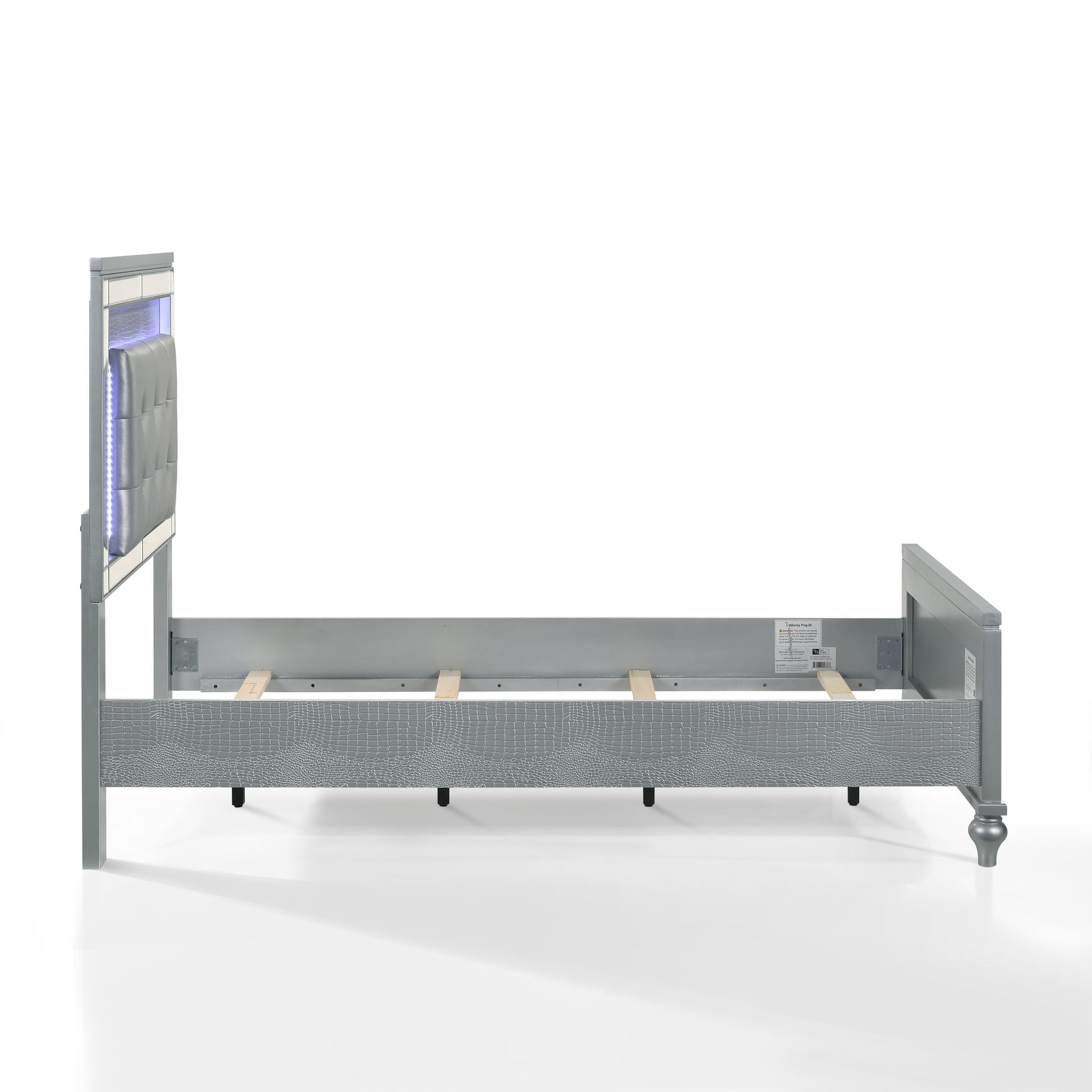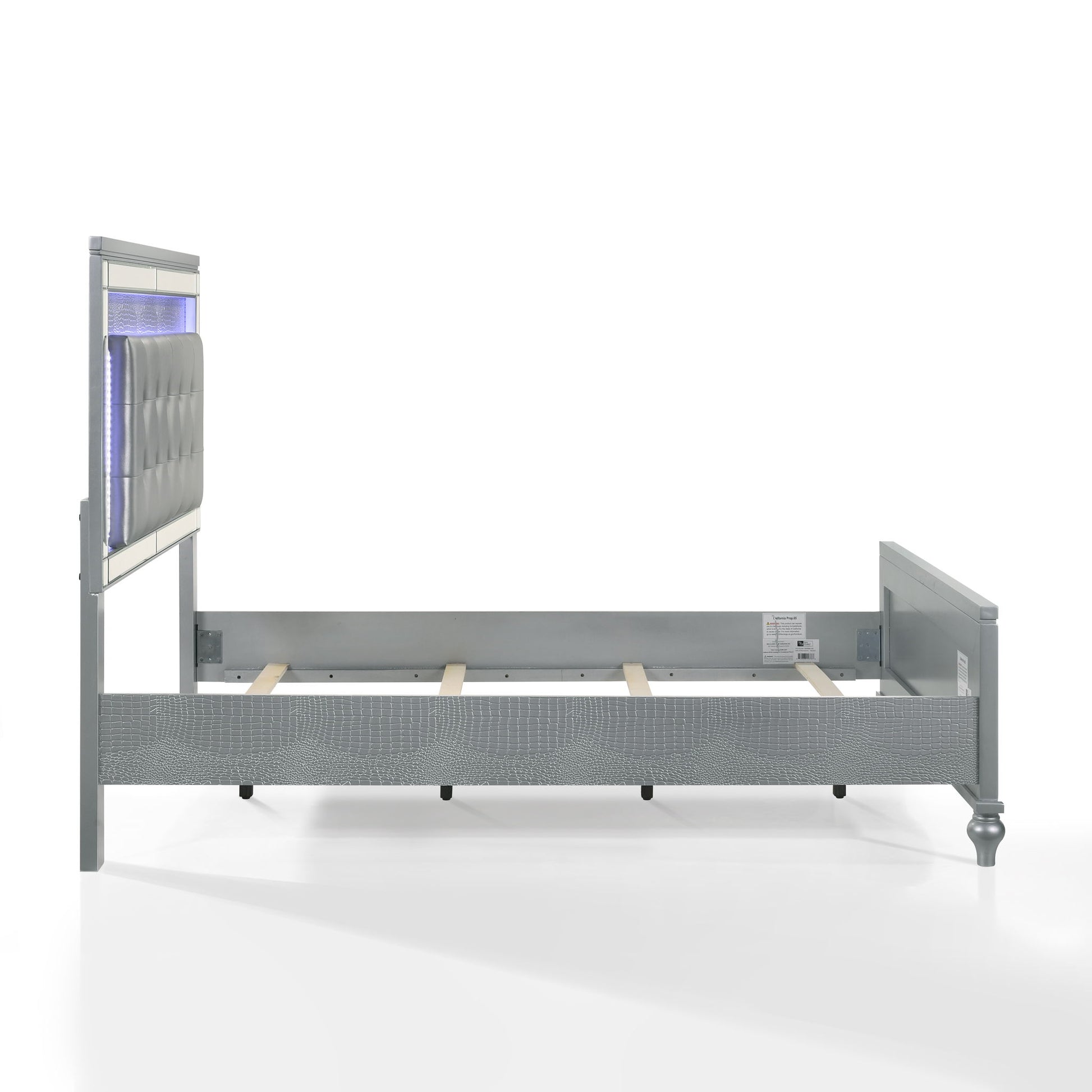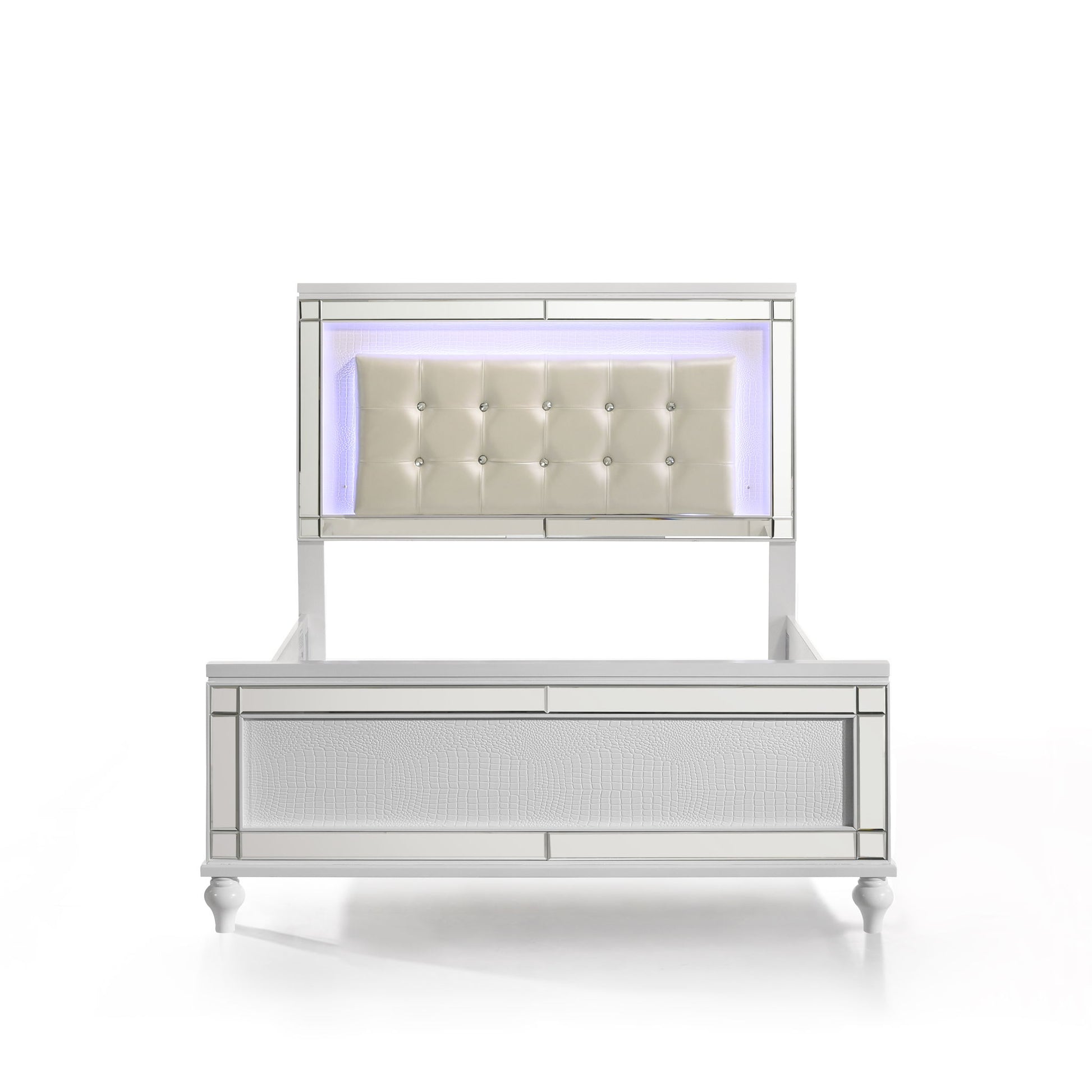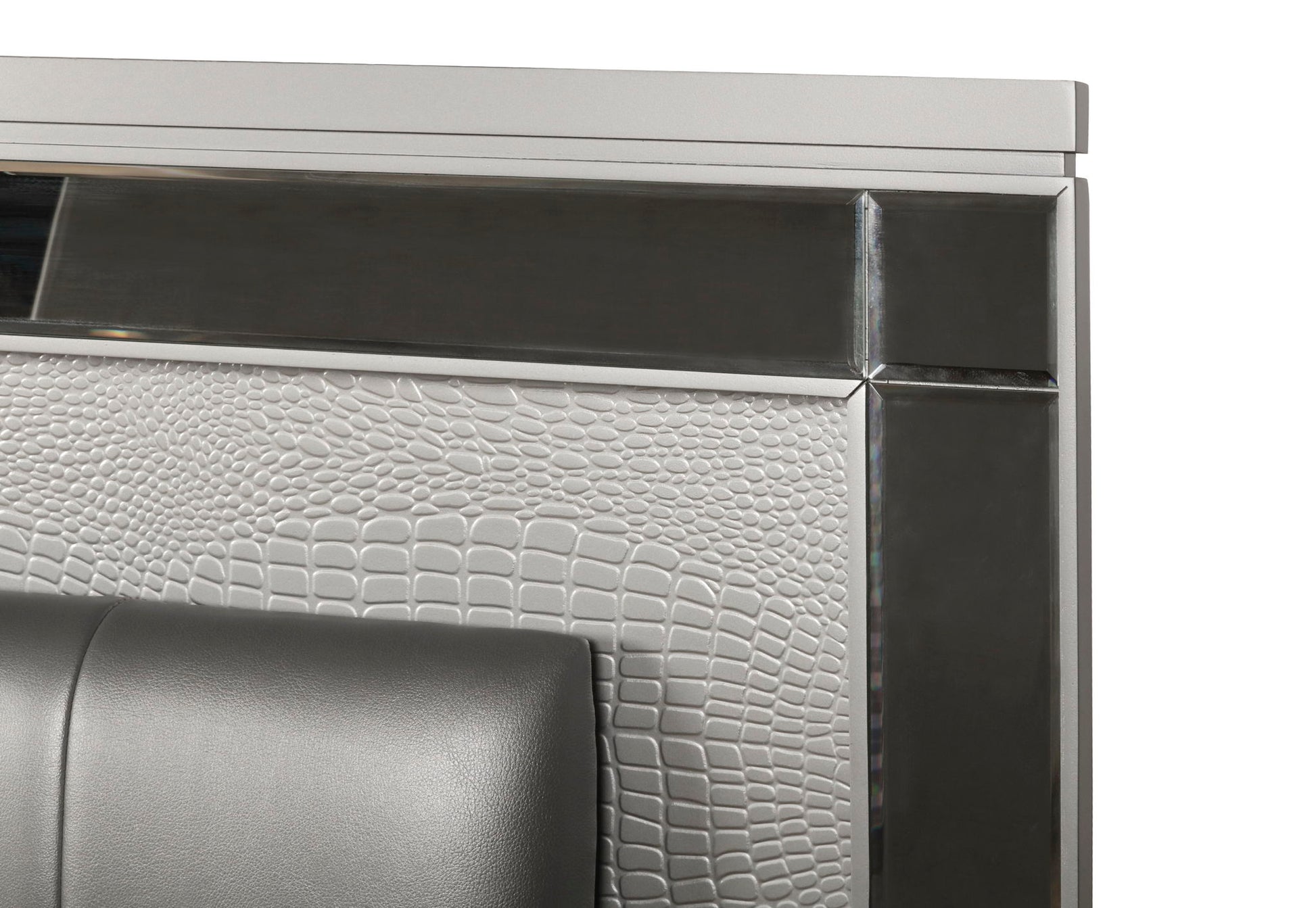 The Valentino Bed with Touch Lighting is designed to transform your bedroom into a glamorous sanctuary. This opulent set is meticulously crafted from a blend of manufactured and solid woods, ensuring lasting quality and a distinctive appearance. The bed showcases a dazzling crystal button-tufted padded headboard, mirrored trim, and exquisite alligator embossed inlays, all of which evoke an unparalleled Hollywood glam vibe. The sophisticated touch-controlled LED lighting offers soft, ambient illumination, creating an intimate and luxurious atmosphere. This magnificent bed set brings a touch of star quality to your contemporary bedroom suite, seamlessly combining extravagant style with exceptional craftsmanship.