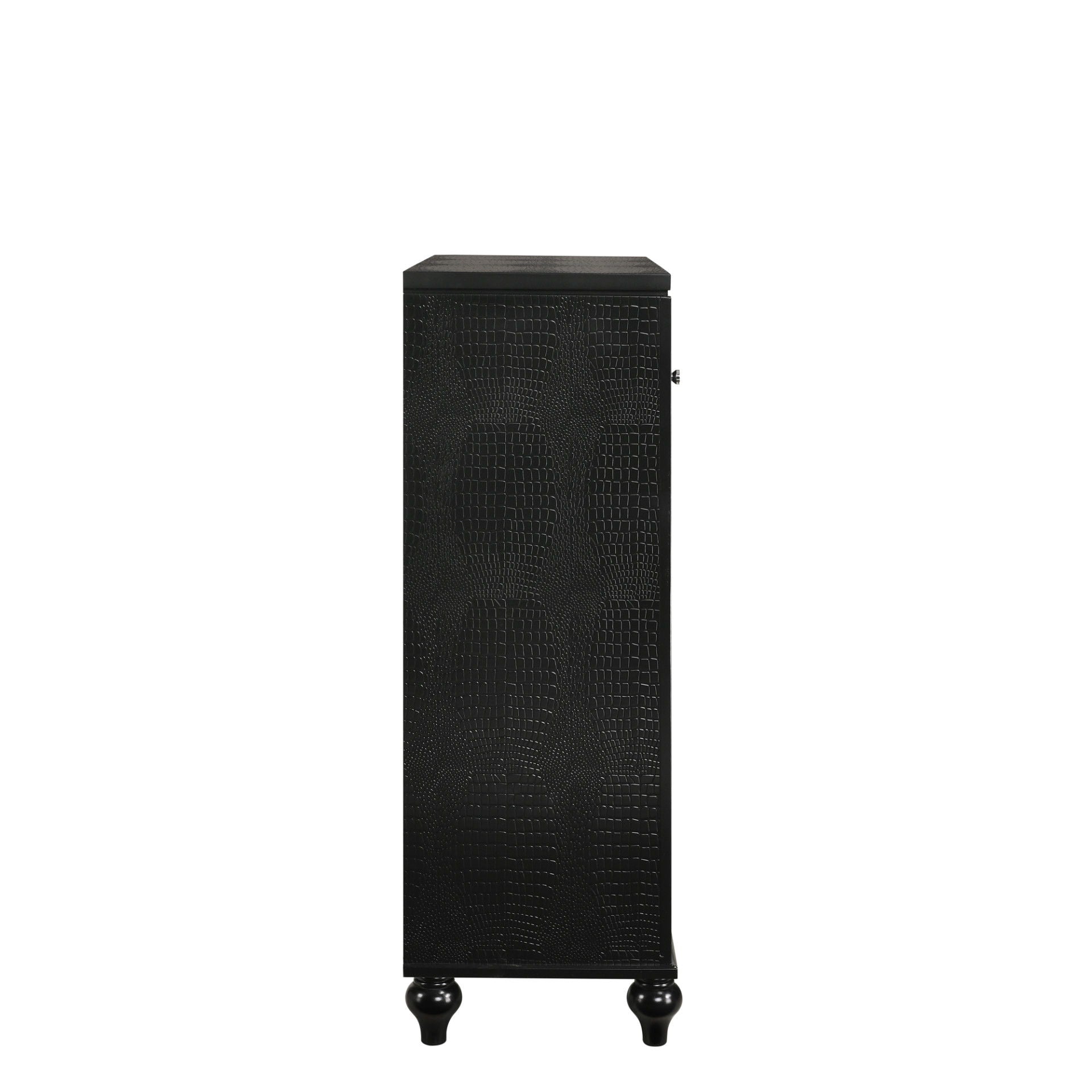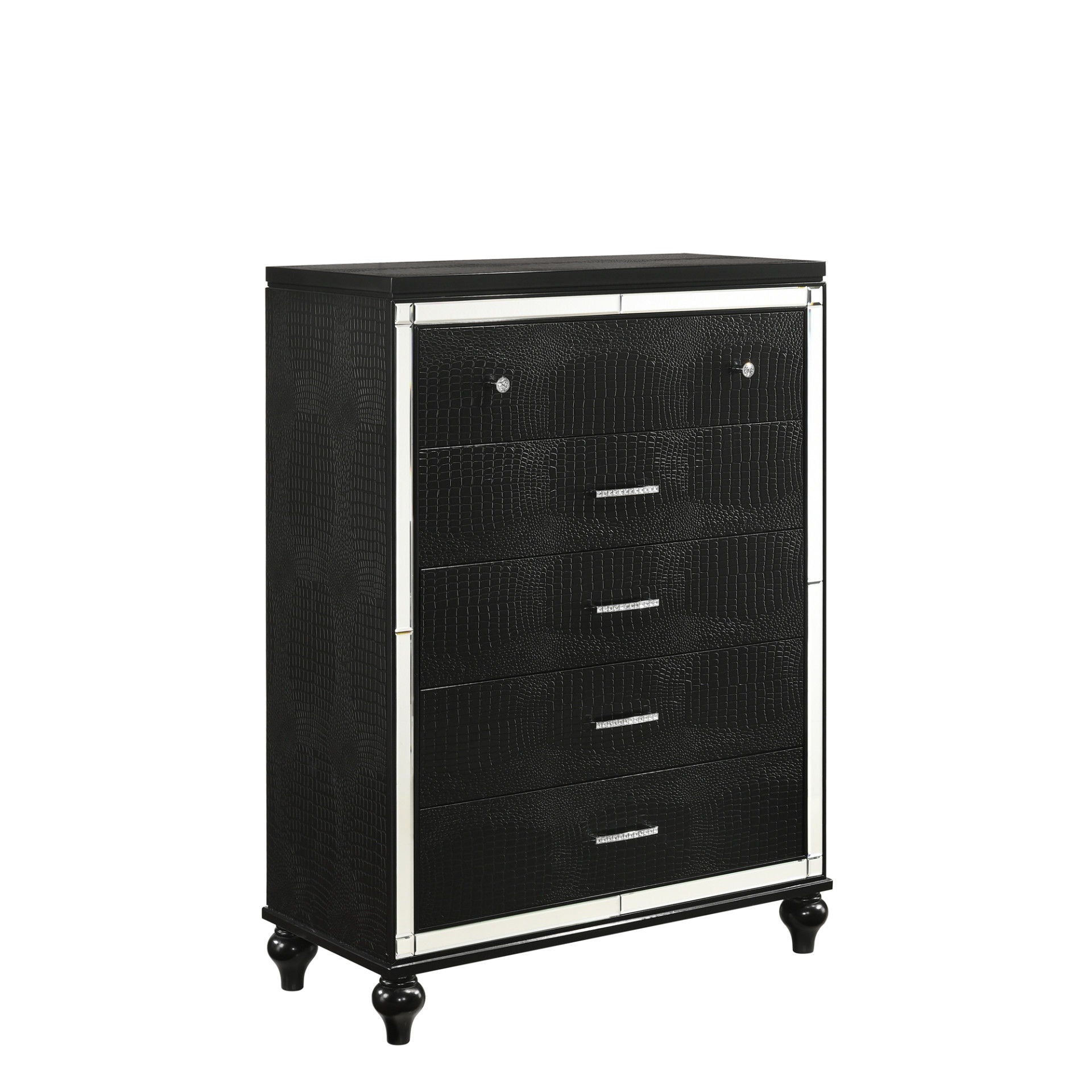 The Valentino 5 Drawer Chest is a testament to enduring craftsmanship crafted from a blend of manufactured and solid woods, adorned with exquisite embossed inlays. Radiating with glitz and glam, its gleaming finish, mirrored trims, crystal-studded drawer pulls, and alligator-embossed accents capture the essence of Hollywood allure. Delight in its thoughtful details, from heirloom-crafted English dovetailed drawers with snag-free interiors to smooth full-extension ball-bearing glides. With an abundance of storage, this chest offers ample space to organize your clothing and belongings effortlessly. Experience luxury and functionality combined in this distinctive piece—a must-have addition to any bedroom sanctuary.