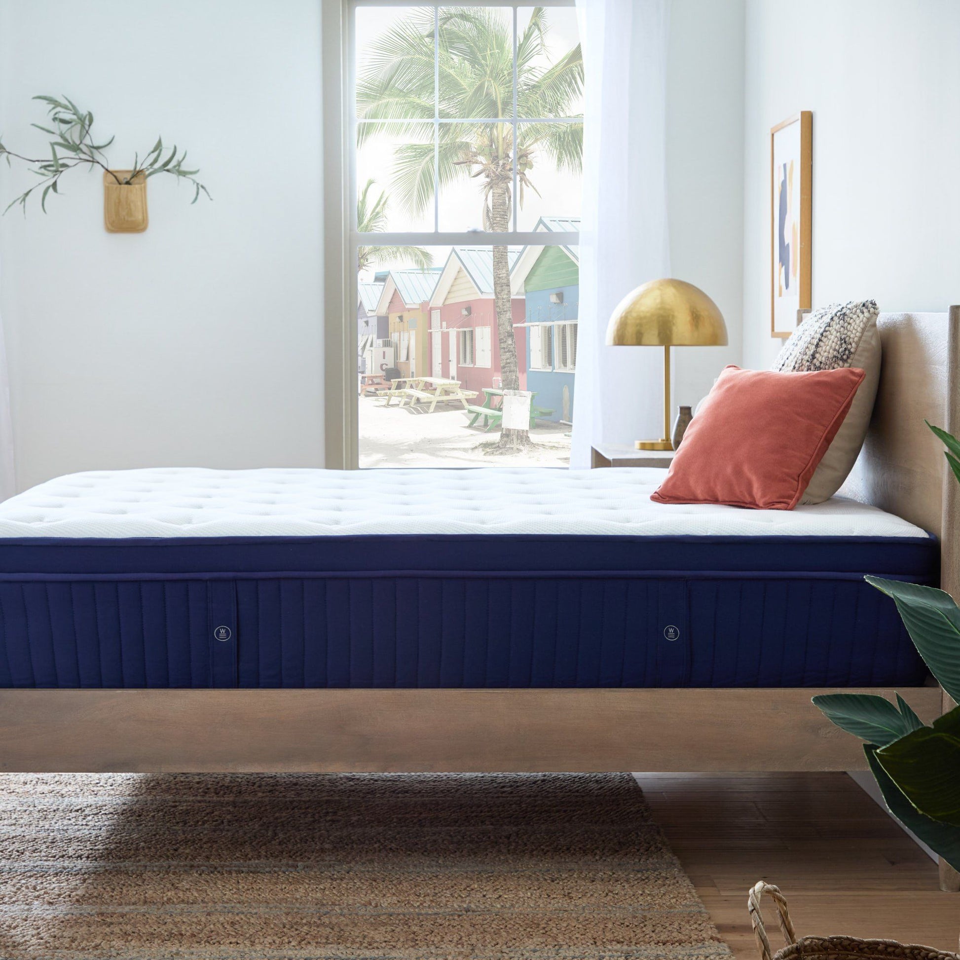 With the new Weekender™ Euro Top Hybrid Mattresses, you can sleep like you’re on vacation. This new take on a more traditional look features a tufted euro top design with channeled sidewalls in a rich blue. This 13-inch construction features layers of convoluted memory foam to increase airflow and cradle pressure points, deep high-density foam for even weight distribution, and steel pocket springs for durable support. The layer of coils has thicker-gauge coils on the perimeter for long-lasting edge support. Designed with a medium-plush feel, this hybrid mattress will appeal to all sleep styles and is great for primary suites, guest bedrooms, and more. It comes conveniently rolled and compressed for easy transportation and is backed by a 10-year warranty.