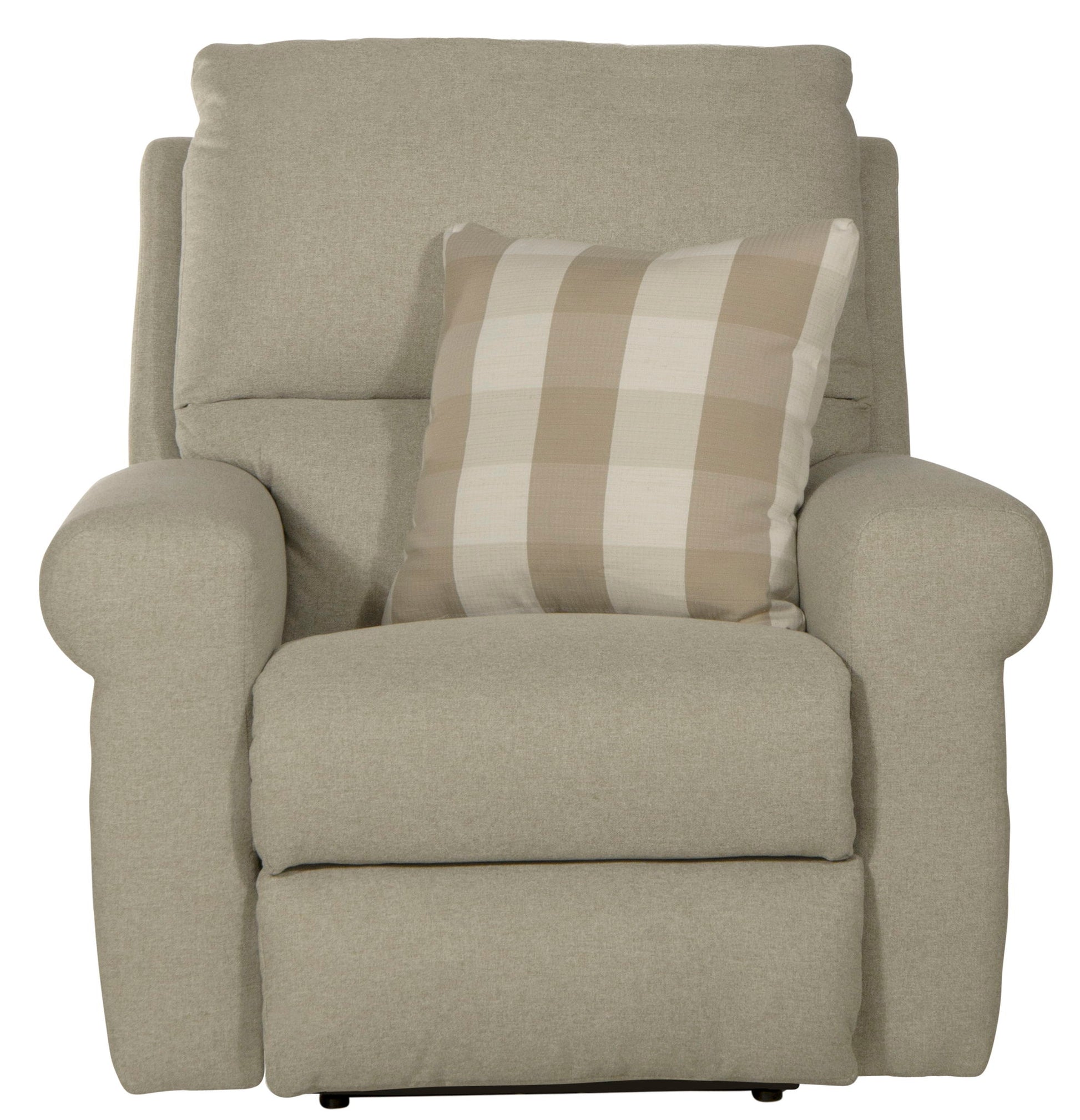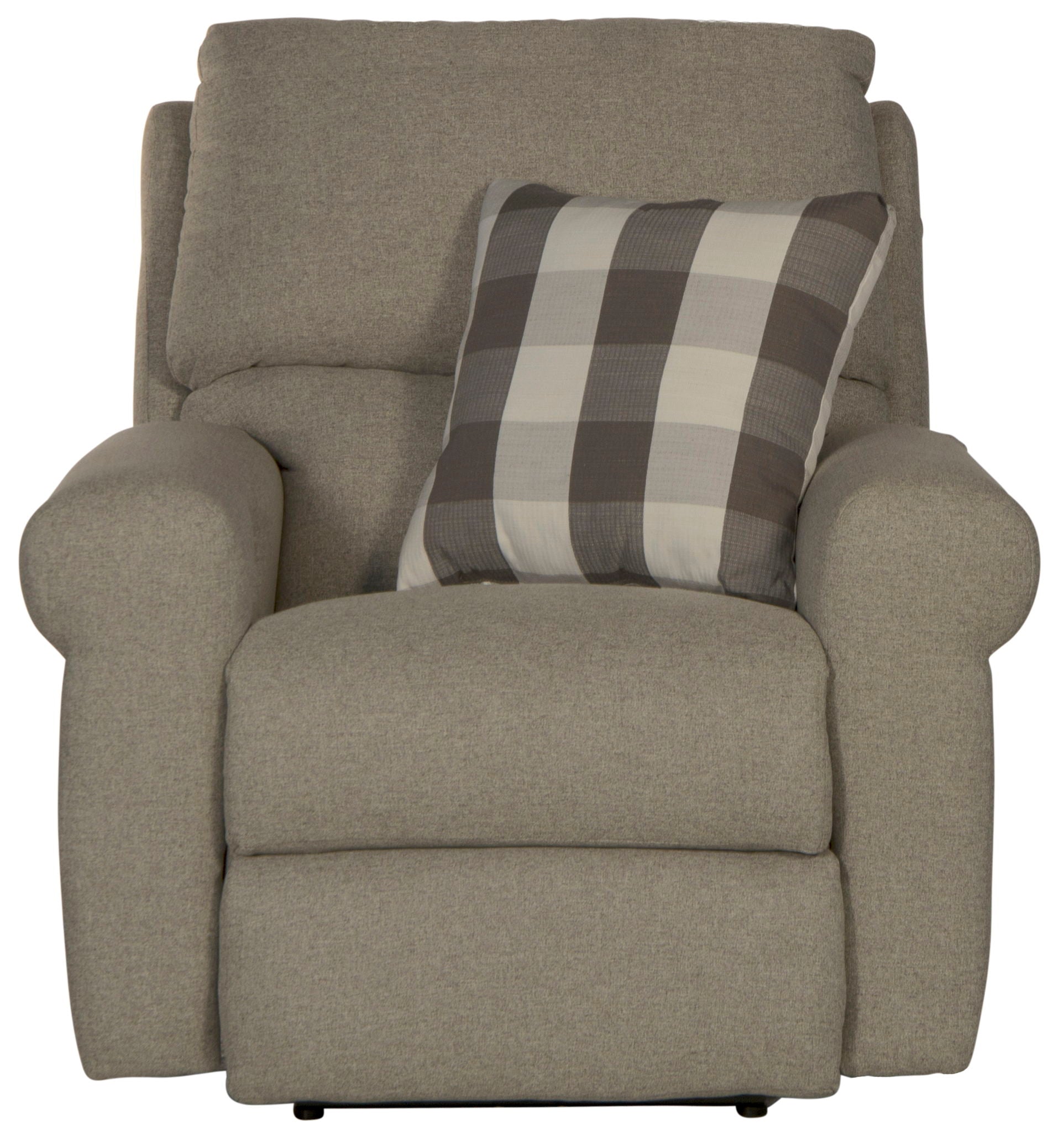 The WESTPORT power lay flat recliner features a Farmhouse Casual style with its Greek Key arm treatment, soft body fabric, and an accent pillow.