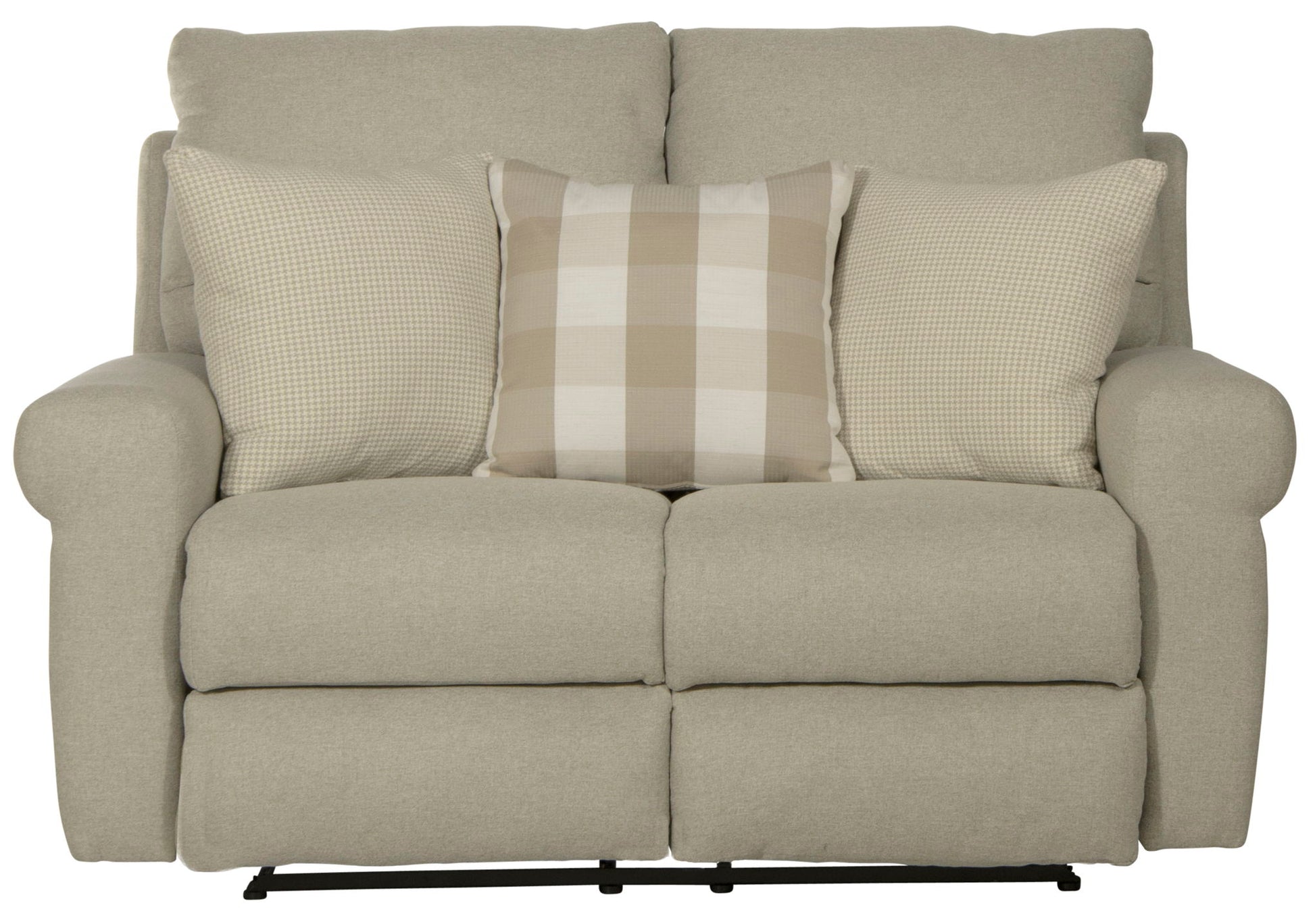 The WESTPORT power lay flat reclining loveseat features a Farmhouse Casual style with its Greek Key arm treatment, soft body fabric, and included accent pillows.