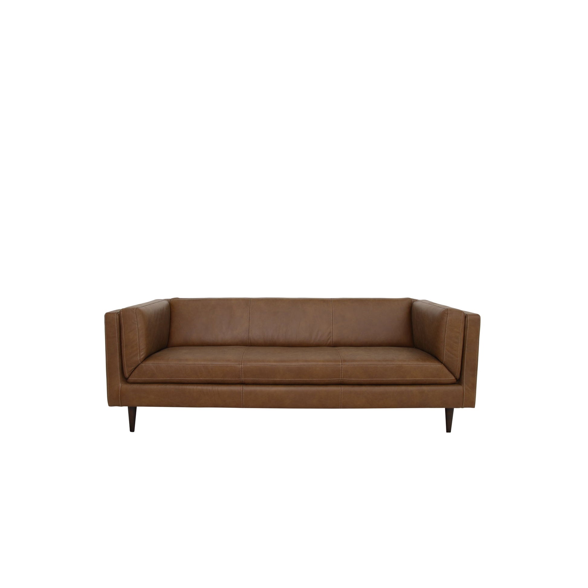 Wrapped in rich top-grain leather, the Woods sofa's mid-century-inspired silhouette features enveloping cushioned arms and tapered wooden legs. Patinaed hues exude warmth, while subtle stitching adds refinement to the sink-into comfort of fiber-topped cushions.